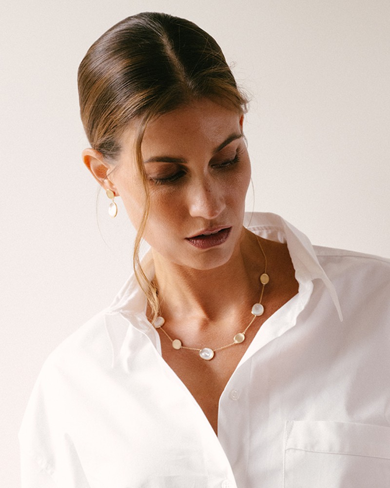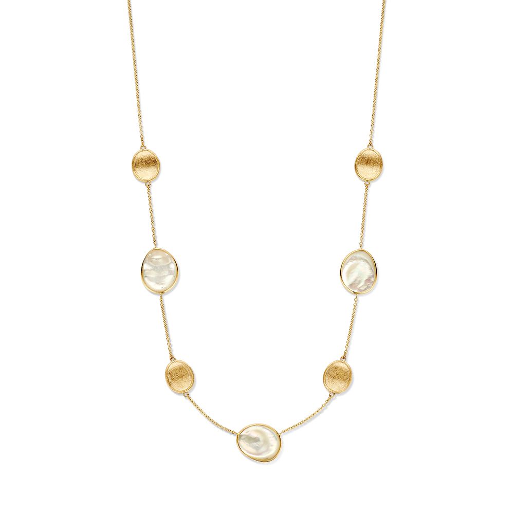 Geelgouden collier met prachtige matgouden en parelmoer elementen in organische vorm.