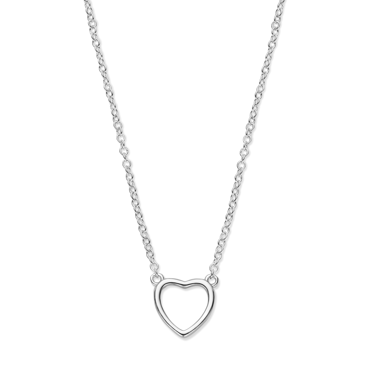 Gerhodineerd zilveren collier met een open hart. Het collier is onderdeel van een set. De lengte van het collier bedraagt 41cm met 4cm extensie. De schakelbreedte bedraagt 1.3mm.