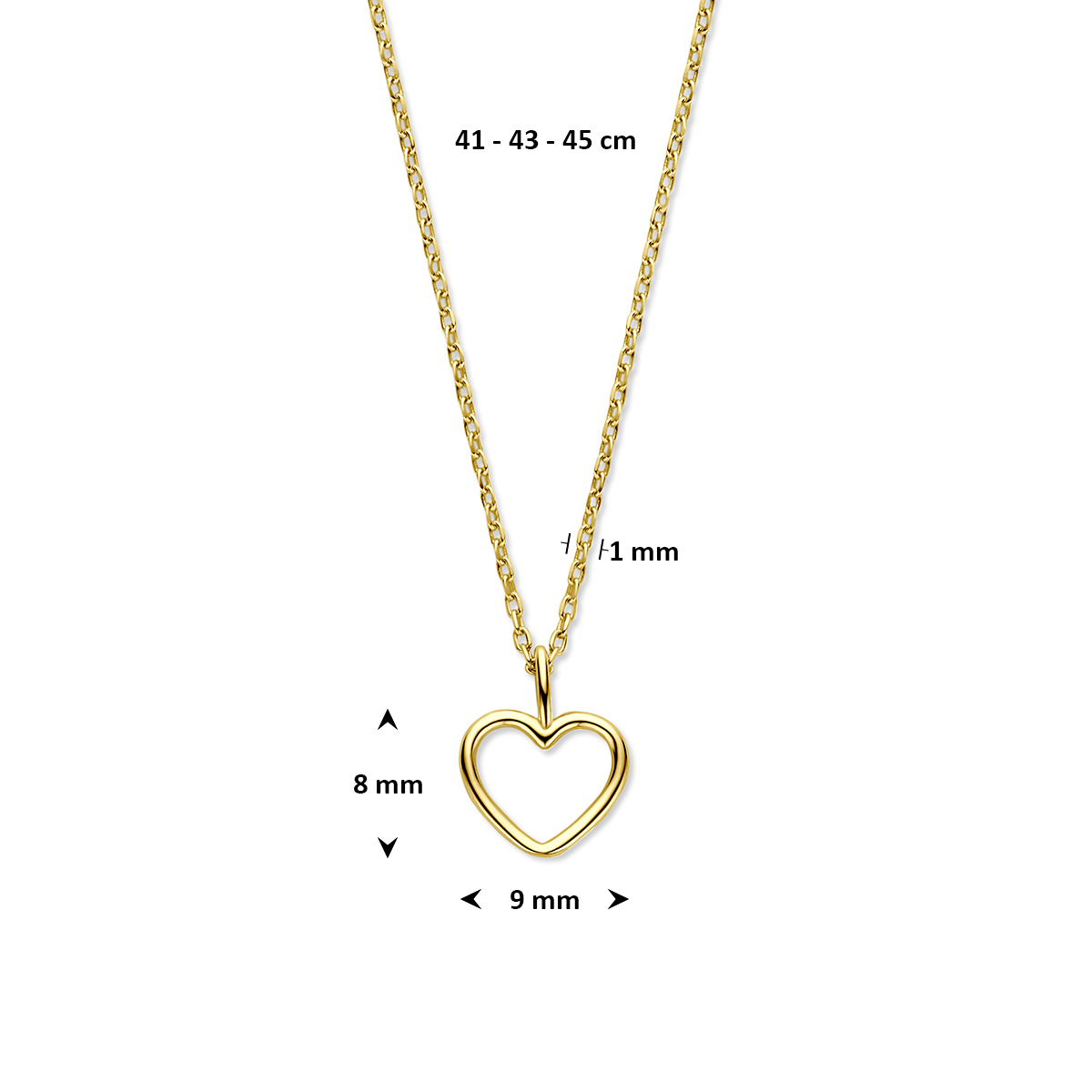 14k Geelgouden collier uitgevoerd met een hartje. Het collier heeft draaglengtes van 41-43-45cm.