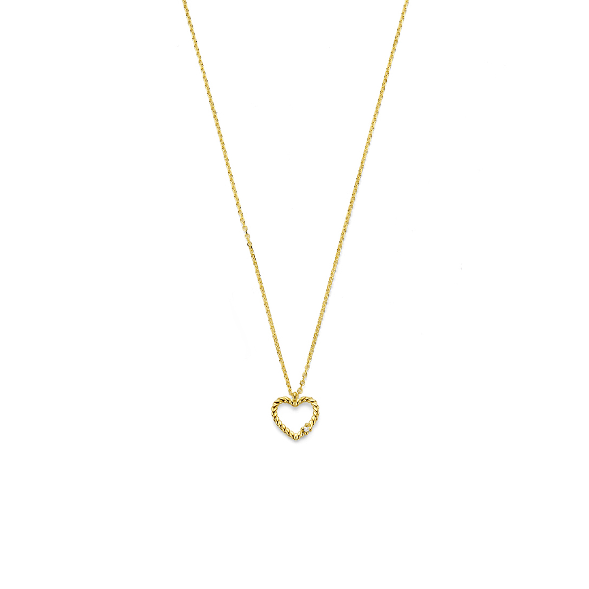 14k Geelgouden collier uitgevoerd met een hartje en diamant. Het collier heeft draaglengtes van 41-43-45cm. Het totale diamantgewicht is 0.01ct.