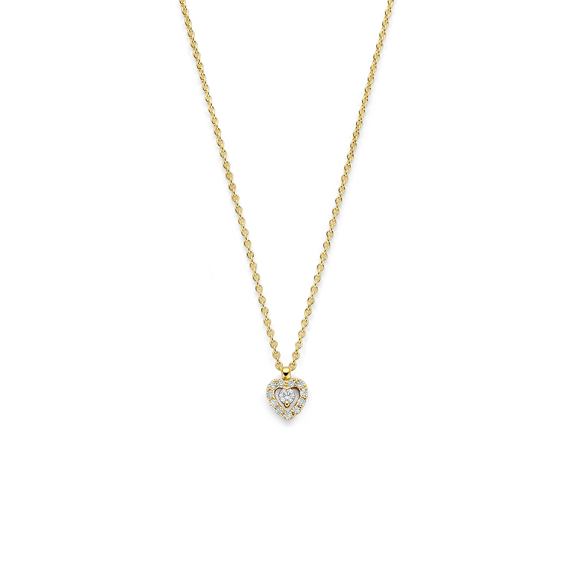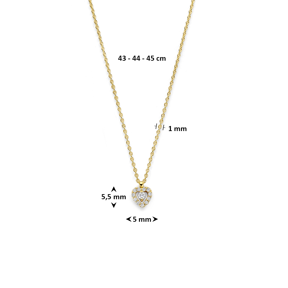 14k Geelgouden collier uitgevoerd met een hartje en diamant. Het collier heeft draaglengtes van 43-44-45cm en een schakelbreedte van 1.5mm. Het totale diamantgewicht is 0.08ct.