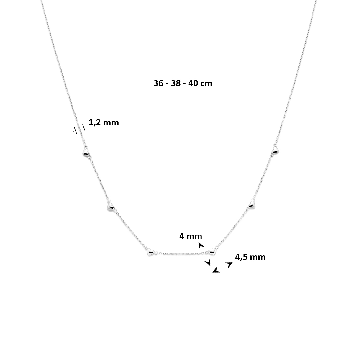 Gerhodineerd 925 zilveren collier met hartjes. Het collier heeft draaglengtes van 36-38-40cm en een schakelbreedte van 1.2mm. Uitgevoerd met karabijnsluiting.