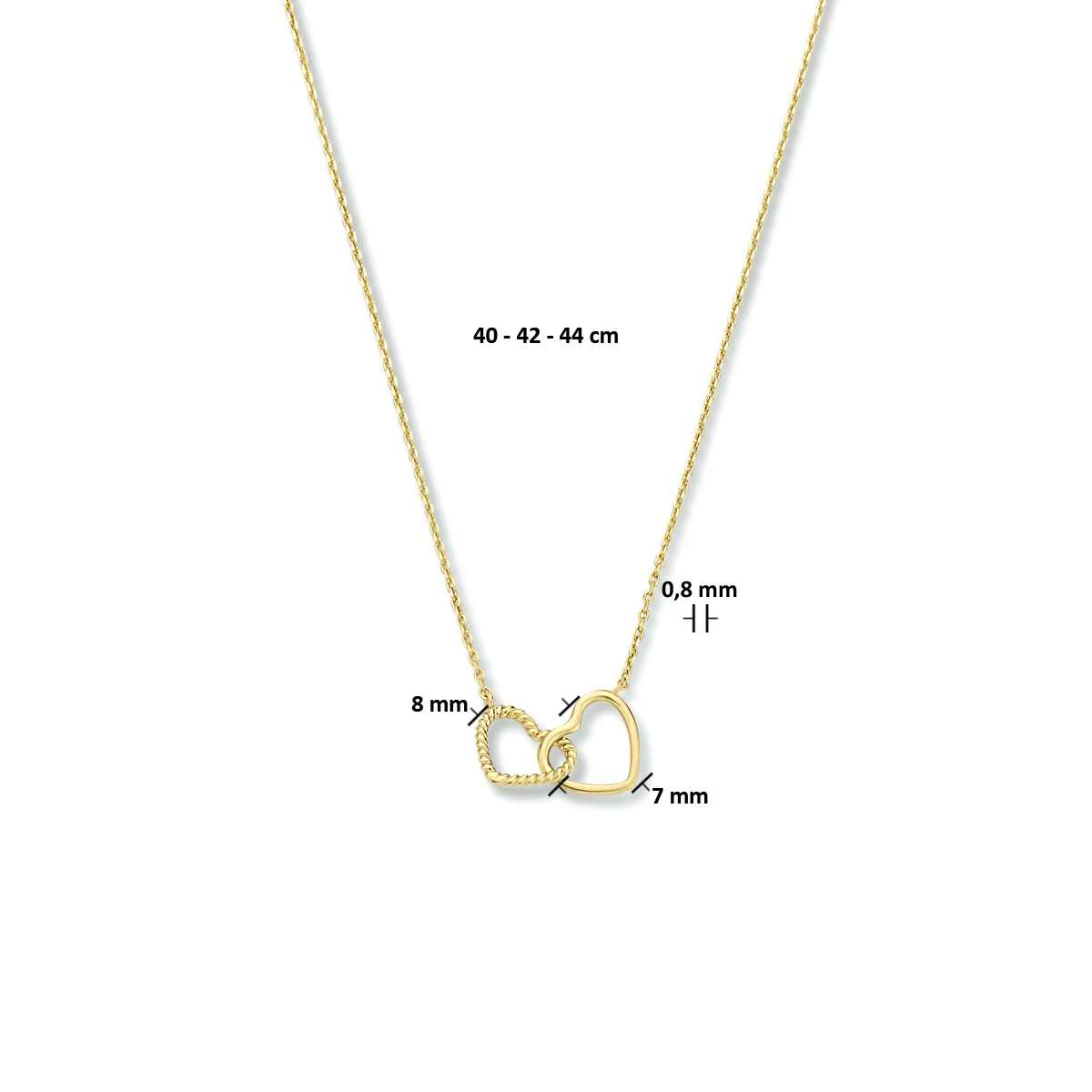 14k Geelgouden collier uitgevoerd met twee hartjes. Het collier heeft draaglengtes van 40, 42 en 44cm. De hartjes hebben beide een afmeting van 7x8mm. De schakelbreedte is 0.8mm.