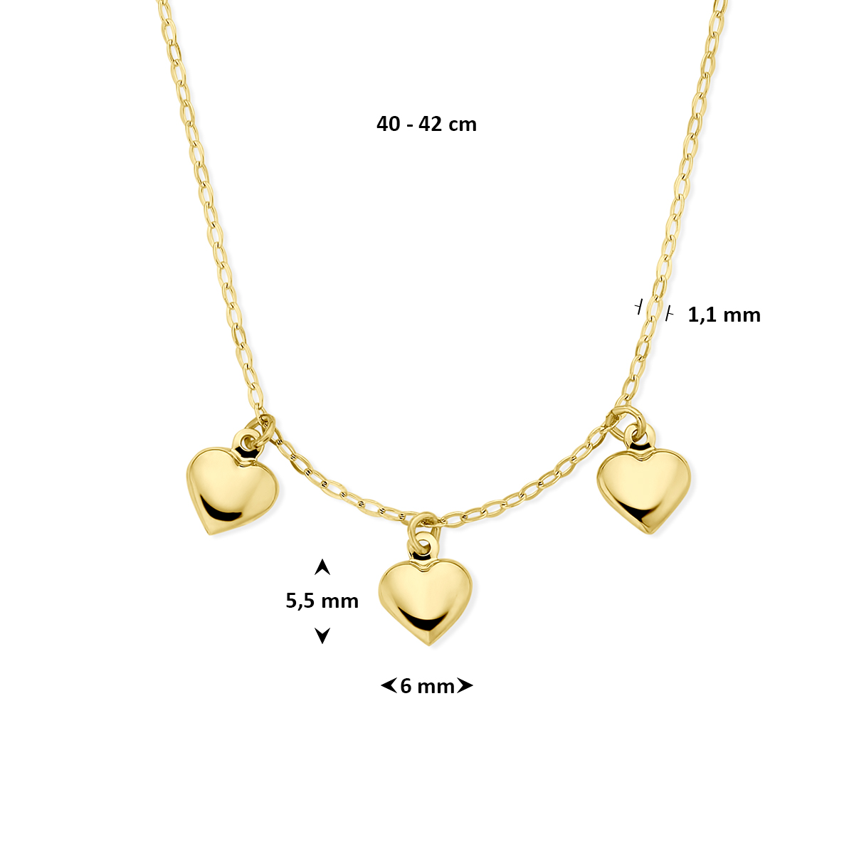 14k Geelgouden collier uitgevoerd met hartjes. Het collier heeft draaglengtes van 40-42cm.