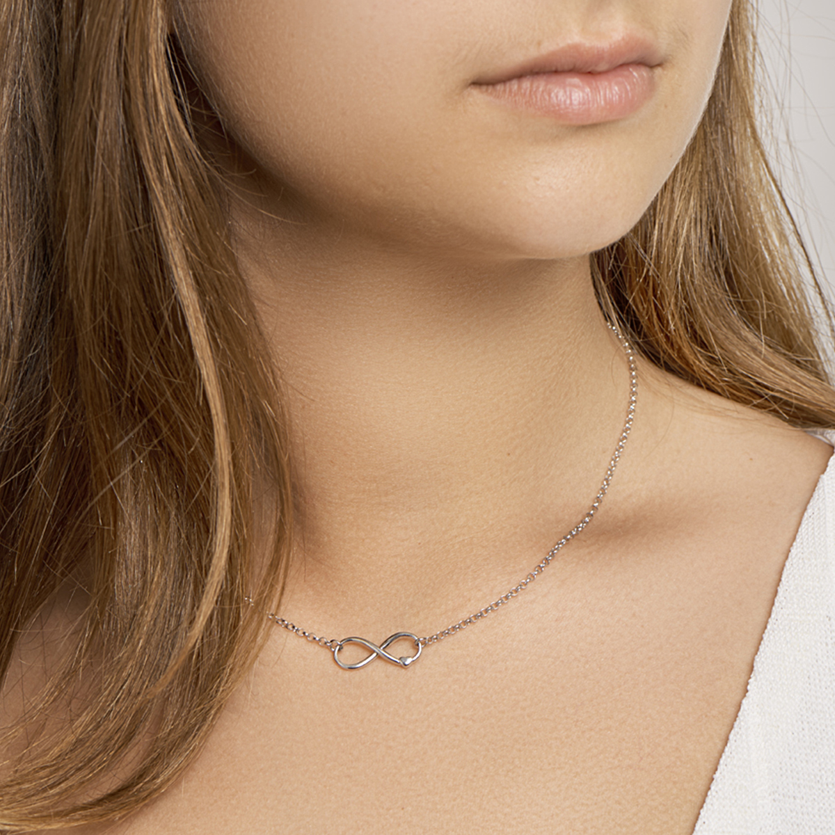 Gerhodineerd zilveren collier met infinity teken en een hart. Het collier is onderdeel van een set. De lengte bedraagt 40cm met 4cm extensie. De schakelbreedte bedraagt 2.0mm.