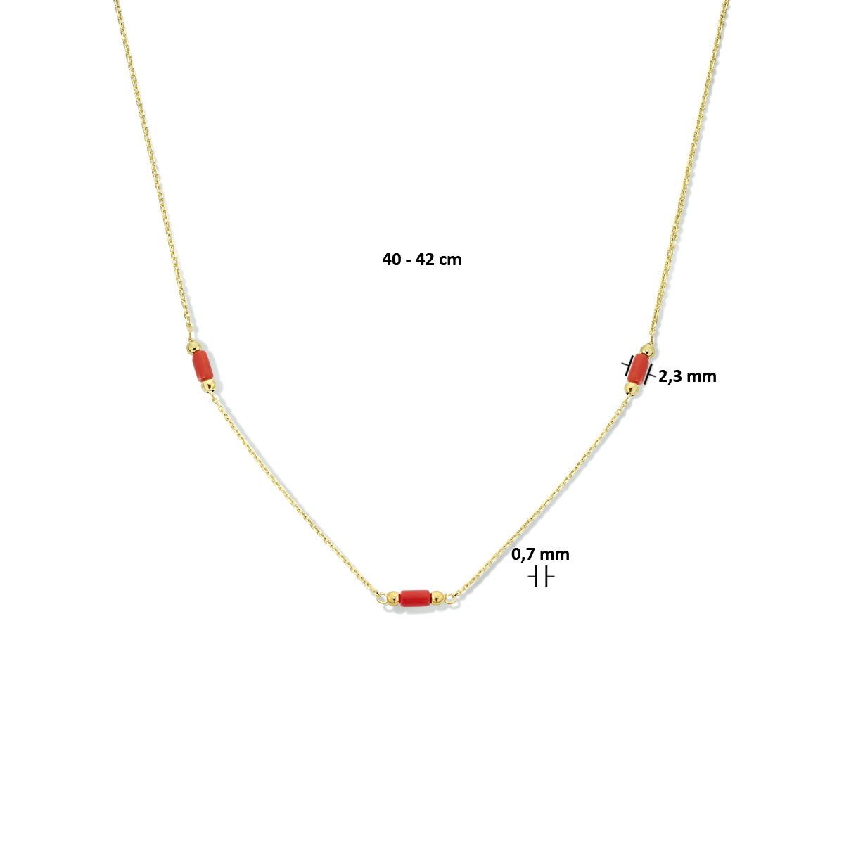 14k Geelgouden collier uitgevoerd met koraal. Het collier heeft een breedte van 2.3mm en draaglengtes van 40 en 42cm. De schakelbreedte is 0.7mm.