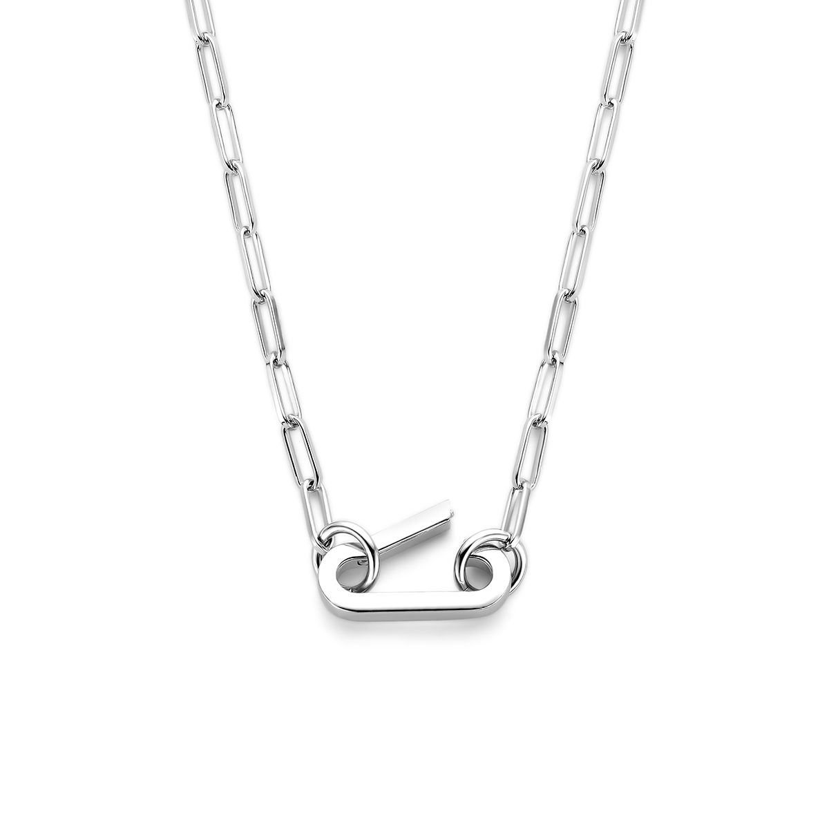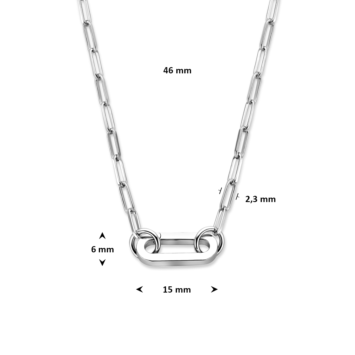 Gerhodineerd 925 zilveren paperclip collier uitgevoerd met een connector. Het collier heeft een draaglengte van 46cm. De connector heeft een afmeting van 6x15mm. Aan de connector kunnen ook hangers worden bevestigd.