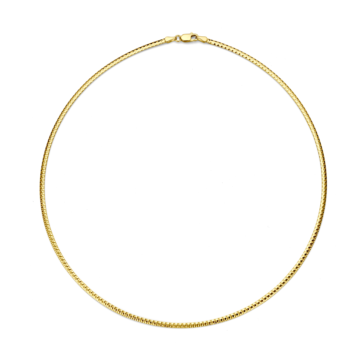 14k Geelgouden collier met een platte omega schakel van 2.5mm. Het collier heeft een draaglengte van 45cm en is uitgevoerd met karabijnsluiting.