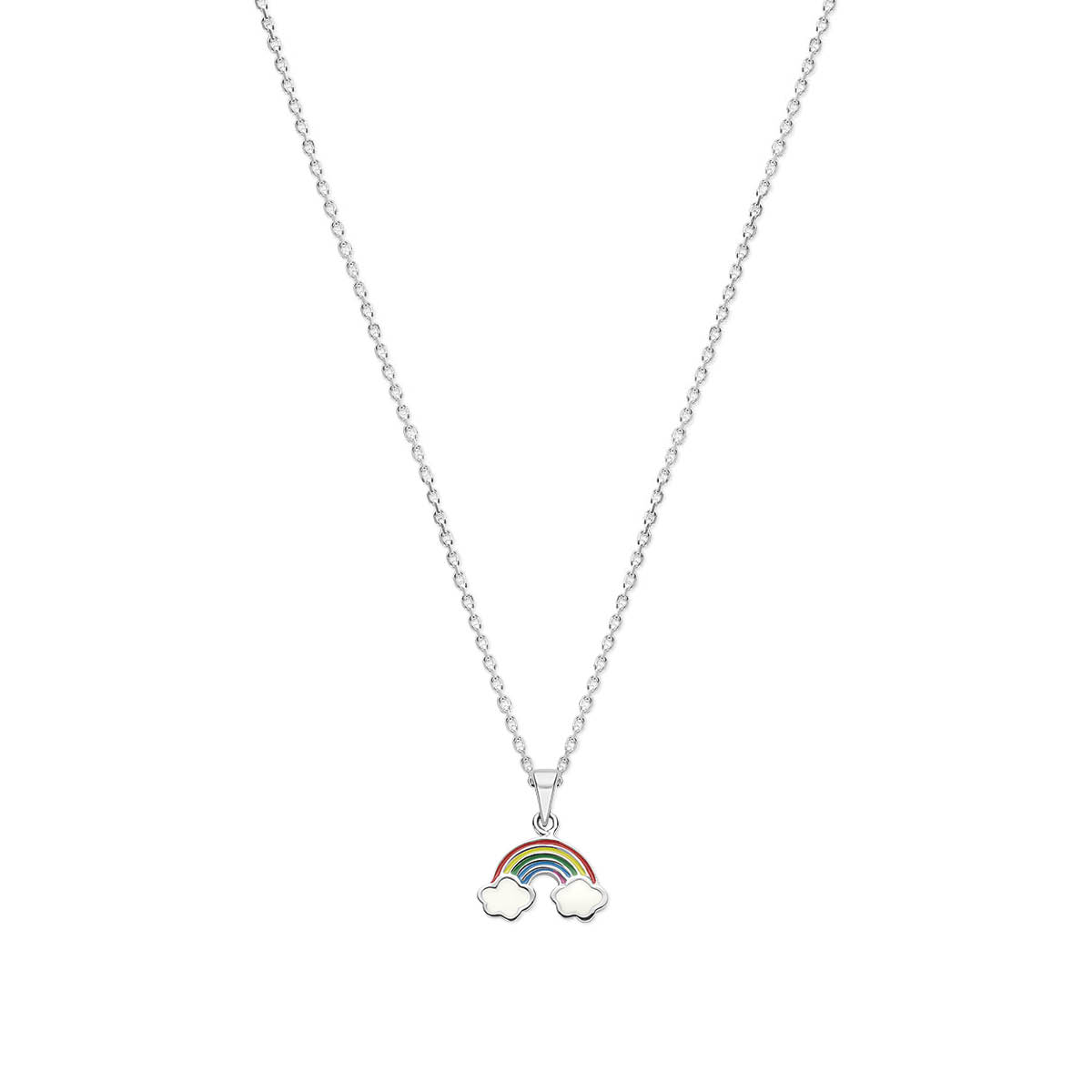 Gerhodineerd 925 zilveren collier uitgevoerd met een regenboog en emaille. Het collier heeft draaglengtes van 36+4cm. De schakelbreedte is 1.4mm.