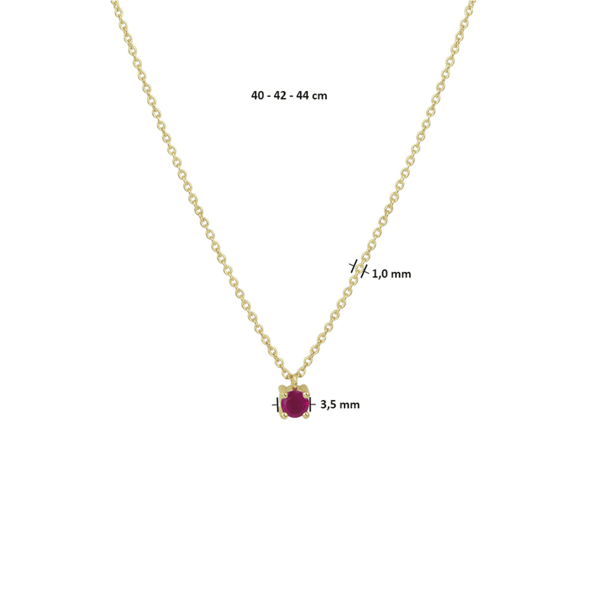 14k Geelgouden anker collier uitgevoerd met een schitterende robijn. Het collier heeft draaglengtes van 40, 42 en 44cm. De schakelbreedte is 1.0mm.