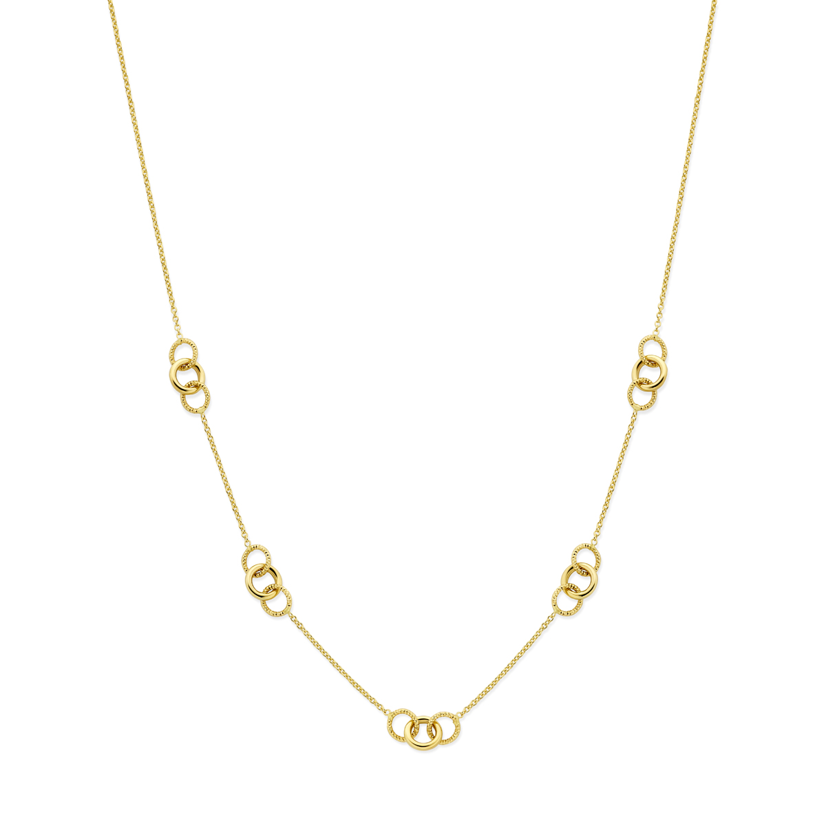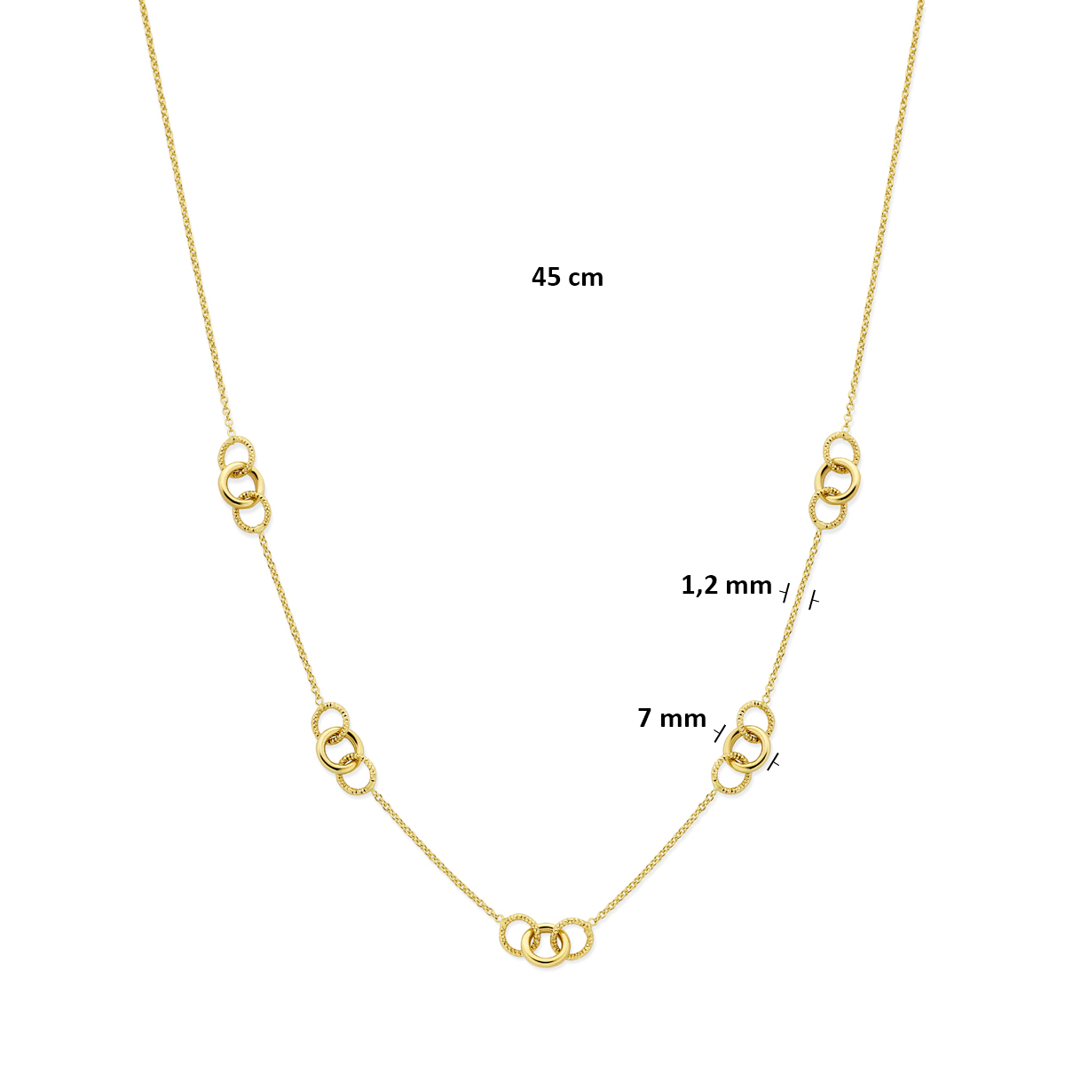 14k Geelgouden collier met rondjes. Het collier heeft een draaglengte van 45cm en een schakelbreedte van 1.2mm. Uitgevoerd met karabijnsluiting.