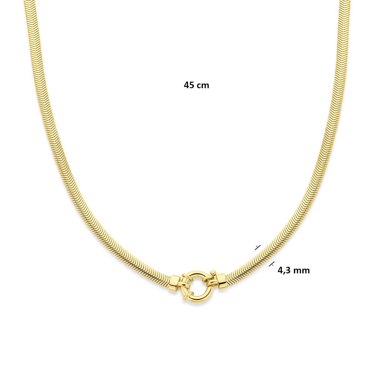Verguld geel 925 zilveren collier met een slang plat schakel van 4.3mm. Het collier heeft een draaglengte van 45cm en is uitgevoerd met een groot veerslot. Geen garantie op plating.