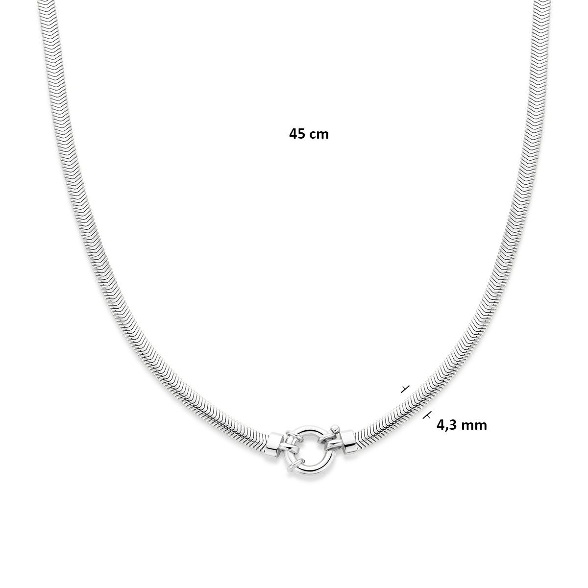 Gerhodineerd 925 zilveren collier met een slang plat schakel van 4.3mm. Het collier heeft een draaglengte van 45cm en is uitgevoerd met een groot veerslot.