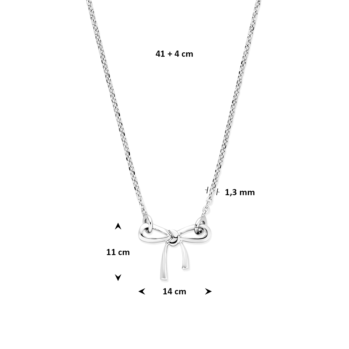 Gerhodineerd 925 zilveren collier uitgevoerd met een strik hanger. Het collier heeft een draaglengte van 41cm met een extensie van 4cm. De schakelbreedte is 1.3mm. Uitgevoerd met een karabijnsluiting.