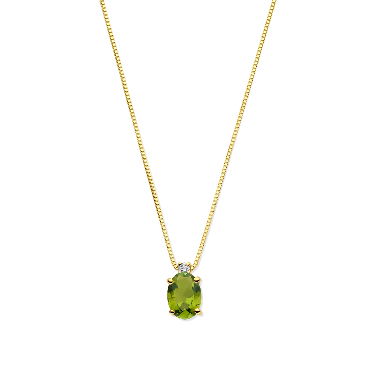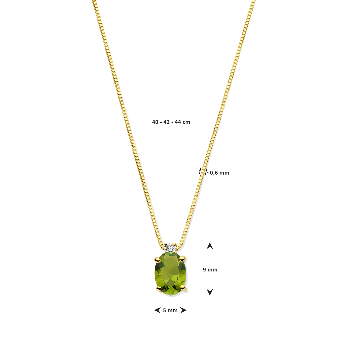 14k Geelgouden collier uitgevoerd met toermalijn en diamant. Het collier heeft draaglengtes van 40-42-44cm en is uitgevoerd met karabijn sluiting. De schakelbreedte is 0.6mm. Het diamantgewicht is 0.02ct.