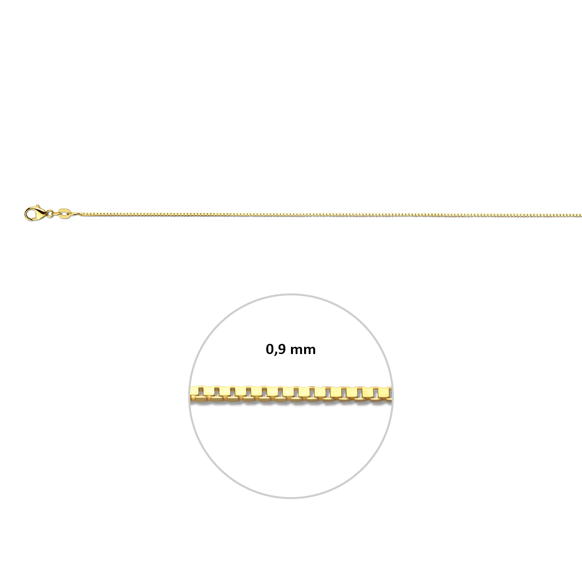 Geelgouden venetiaans collier met een schakelbreedte van 0,9 mm en een draaglengte van 37+5cm. Uitgevoerd met karabijnsluiting.