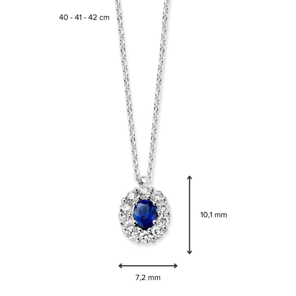 Witgouden collier met entourage hanger met saffier.