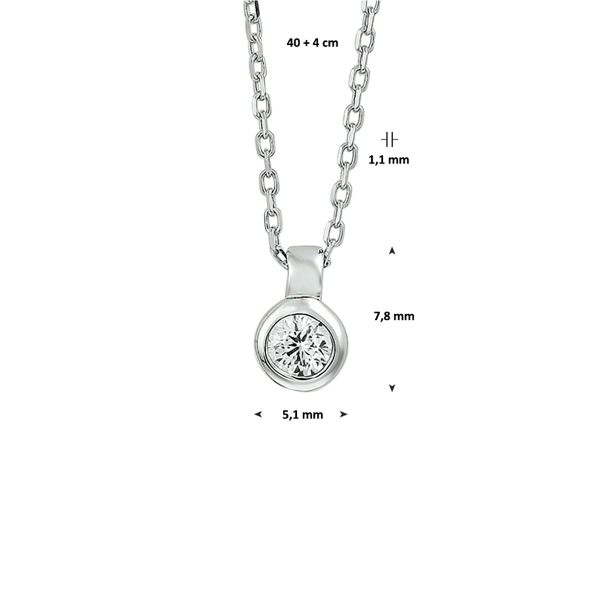 Gerhodineerd zilveren collier met zirkonia en een poli afwerking. De lengte bedraagt 40cm met 4cm extensie en de schakelbreedte bedraagt 1.1mm.