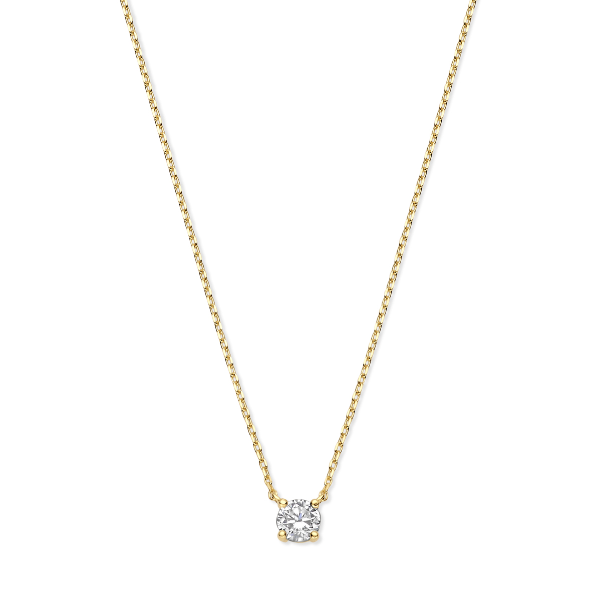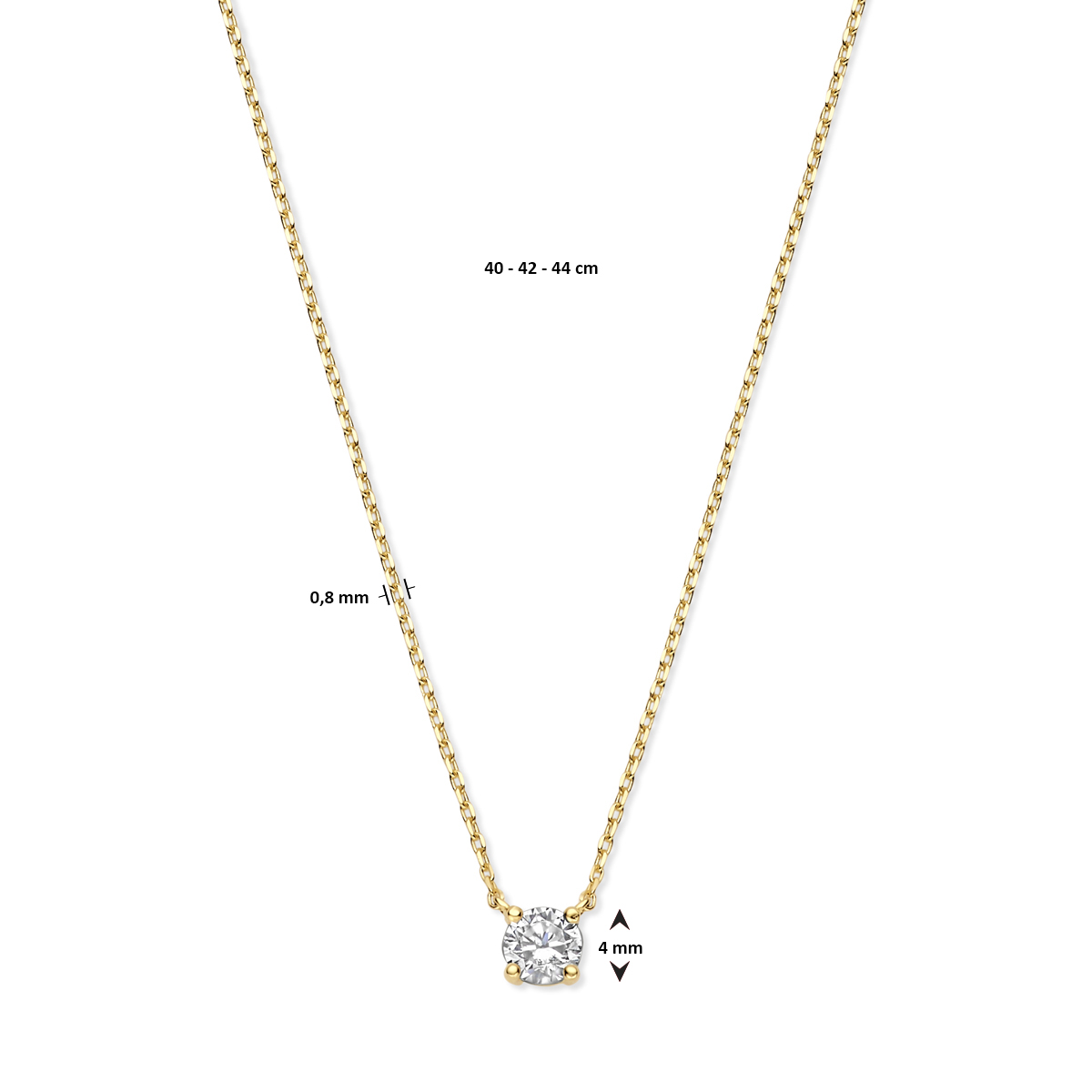 14k Geelgouden collier met zirkonia van 42cm lang. De schakelbreedte bedraagt 0.8mm. De zirkonia steen heeft een diameter van 4mm.