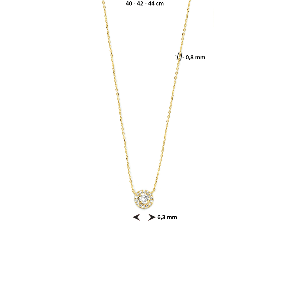 14k Geelgouden collier uitgevoerd met een ronde hanger met daarin zirkonia. Het collier heeft draaglengtes van 40, 42 en 44cm. De hanger heeft een diameter van 6.3mm. De schakelbreedte is 0.8mm.