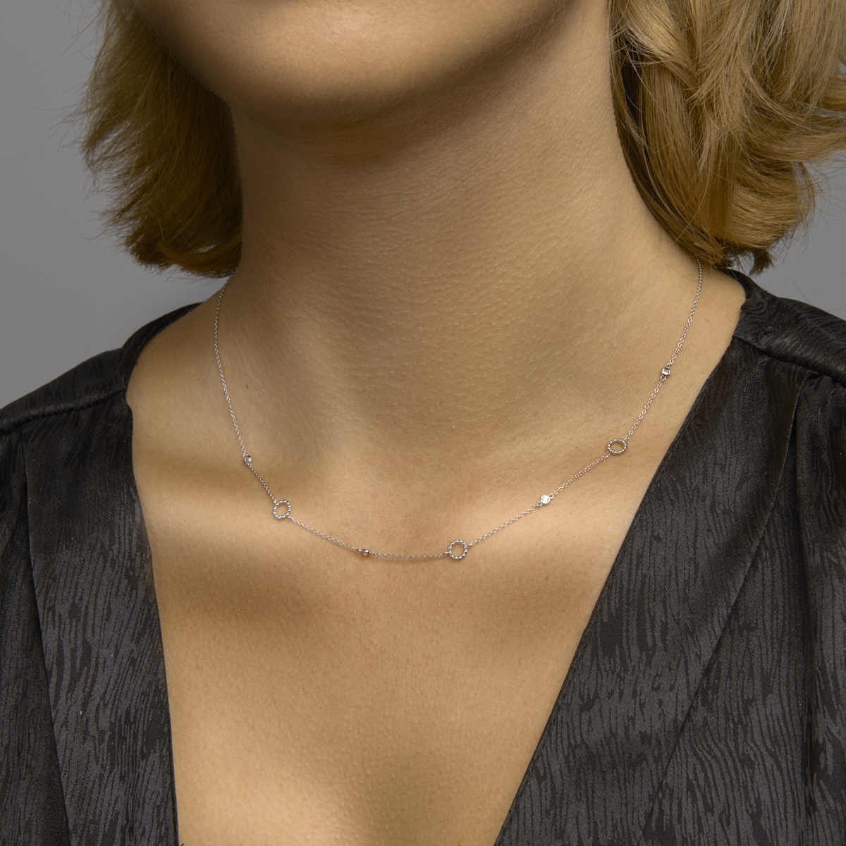 Gerhodineerd 925 zilveren collier uitgevoerd met rondjes en zirkonia. Het collier heeft een draaglengte van 41cm met een extensie van 4cm en een stevige karabijn sluiting. De schakelbreedte is 1.0mm.