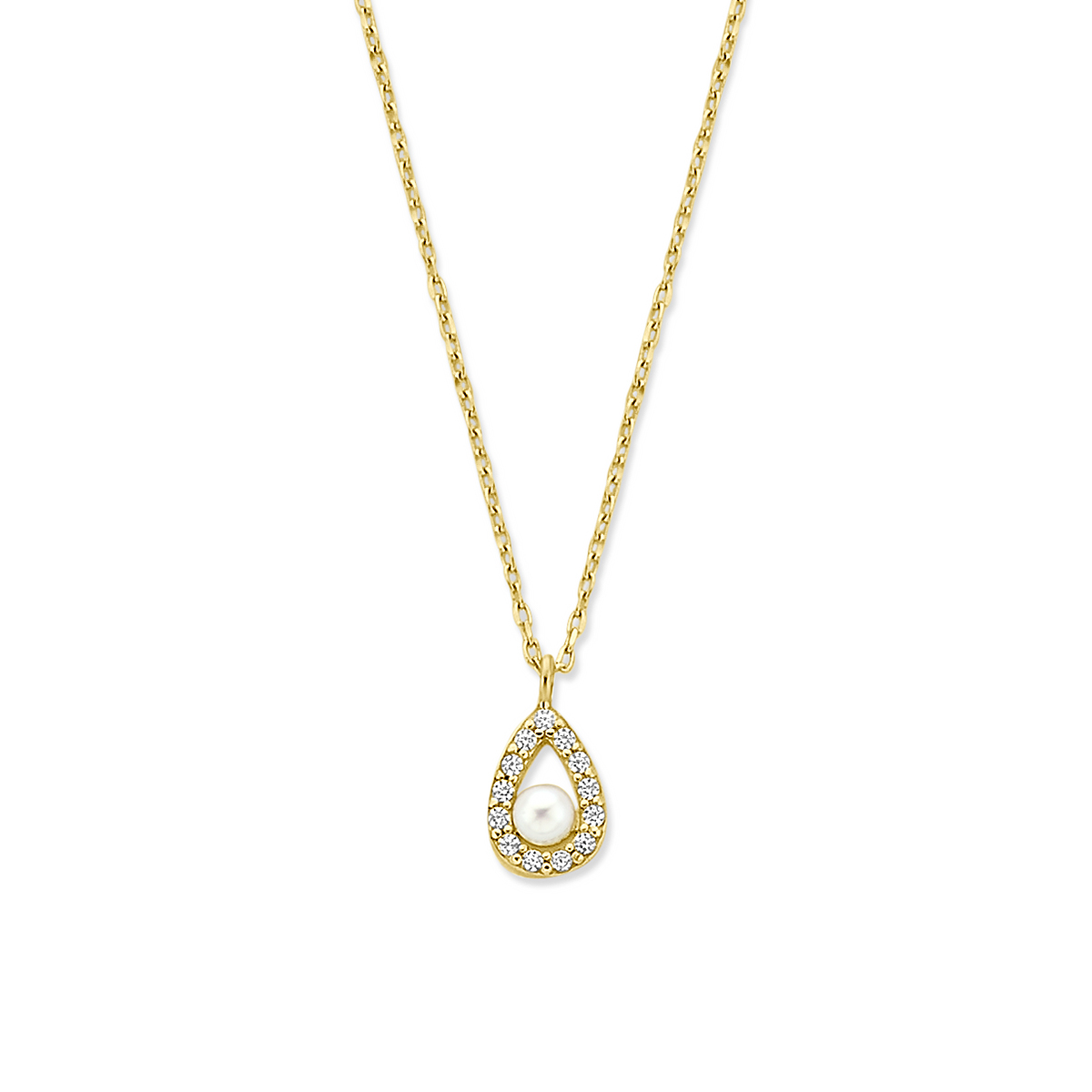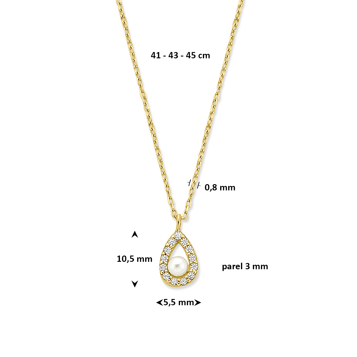 14k Geelgouden collier uitgevoerd met zirkonia en een parel. Het collier heeft draaglengtes van 41-43-45cm en een schakelbreedte van 0.8mm.
