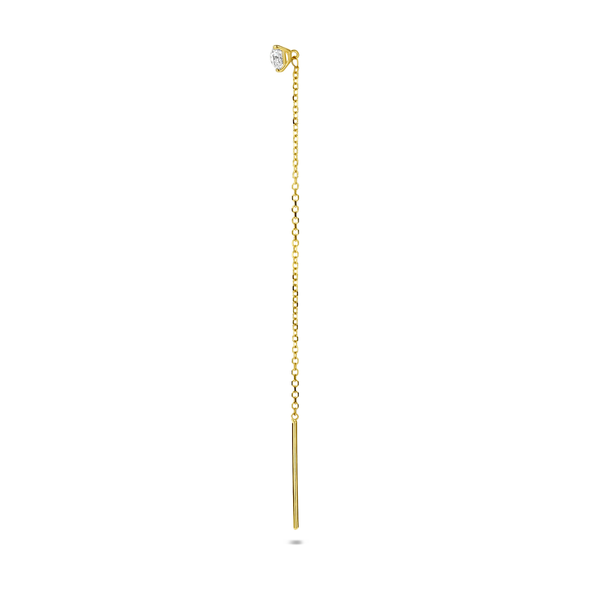 14k Geelgouden doortrekoorbel uitgevoerd met een lab grown diamant. De oorbel heeft een totale lengte van 70mm en een breedte van 1mm. Het totale diamantgewicht is 0.15ct. Lab grown diamanten zijn diamanten die ontstaan in een laboratorium. Onder extreem hoge druk en temperatuur wordt het natuurlijk ontstaansproces nagebootst met als eindresultaat een diamant met dezelfde chemische eigenschappen maar met een andere oorsprong.