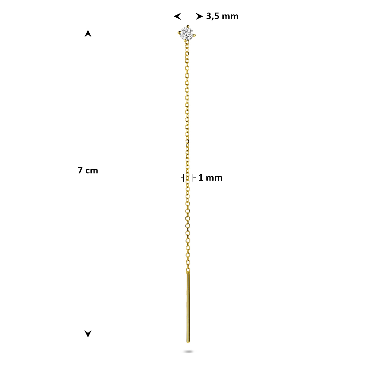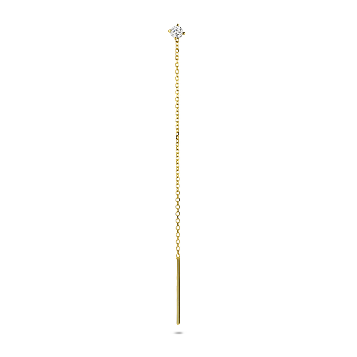 14k Geelgouden doortrekoorbel uitgevoerd met een lab grown diamant. De oorbel heeft een totale lengte van 70mm en een breedte van 1mm. Het totale diamantgewicht is 0.10ct. Lab grown diamanten zijn diamanten die ontstaan in een laboratorium. Onder extreem hoge druk en temperatuur wordt het natuurlijk ontstaansproces nagebootst met als eindresultaat een diamant met dezelfde chemische eigenschappen maar met een andere oorsprong.