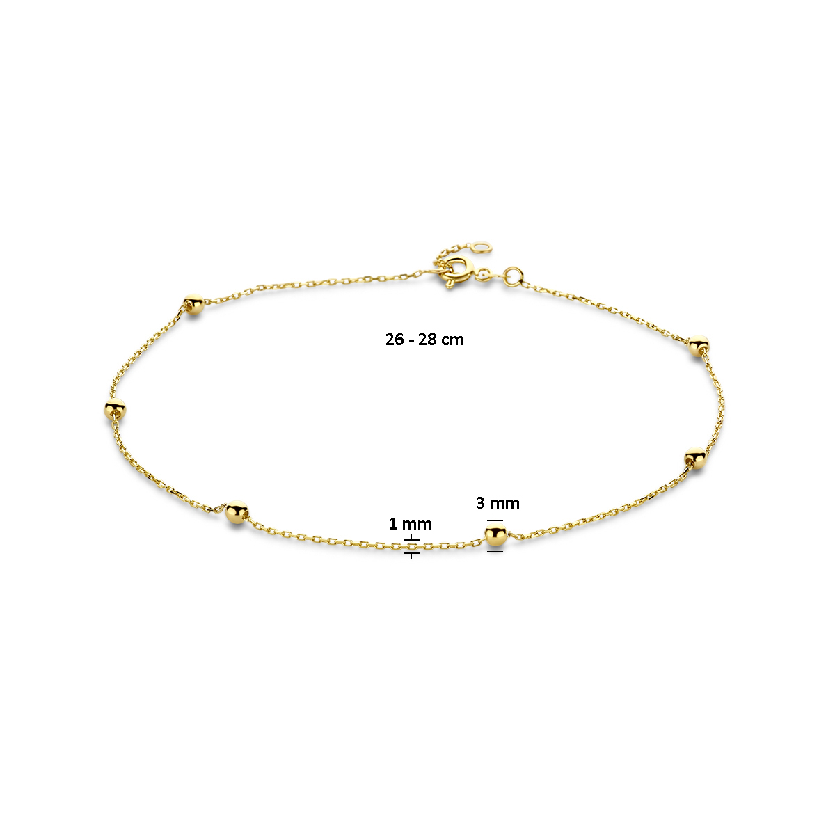 Geelgouden 1mm anker enkelbandje uitgevoerd met poli afgewerkte bolletjes van 3mm. De armband is te combineren met bijpassende sieraden uit onze collectie. Tip: Leuk om kado te geven!