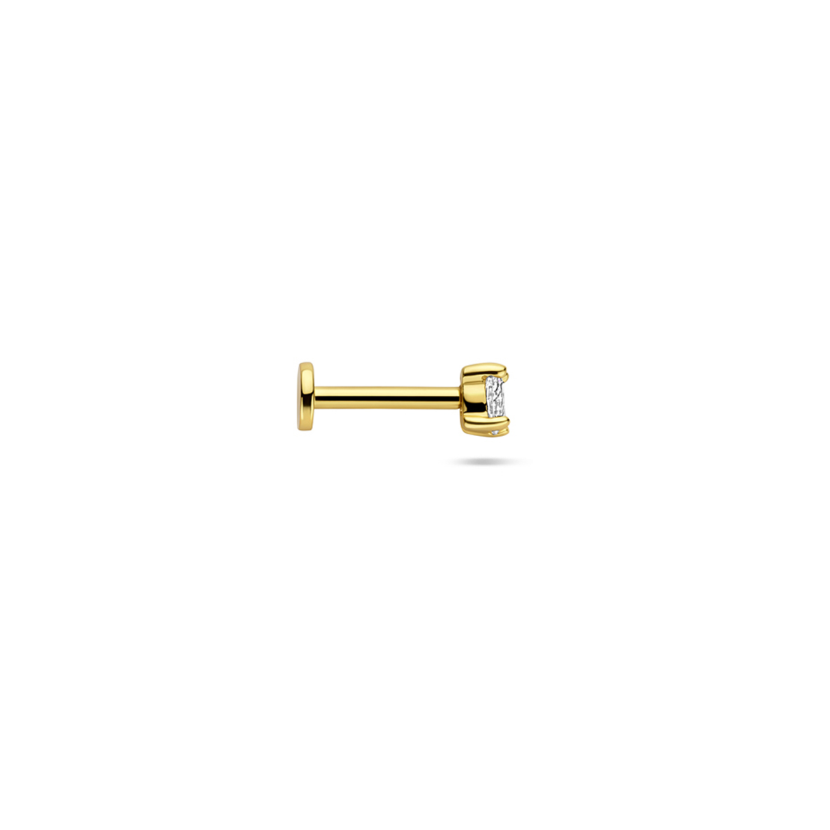 Verguld 925 zilveren flat back piercing met schroefdraad uitgevoerd met zirkonia. Deze piercing heeft een afmeting van 3×2,5mm, een buis lengte van 6,5mm en een buisdikte van 1mm. Worden per stuk verkocht. Geen garantie op plating.