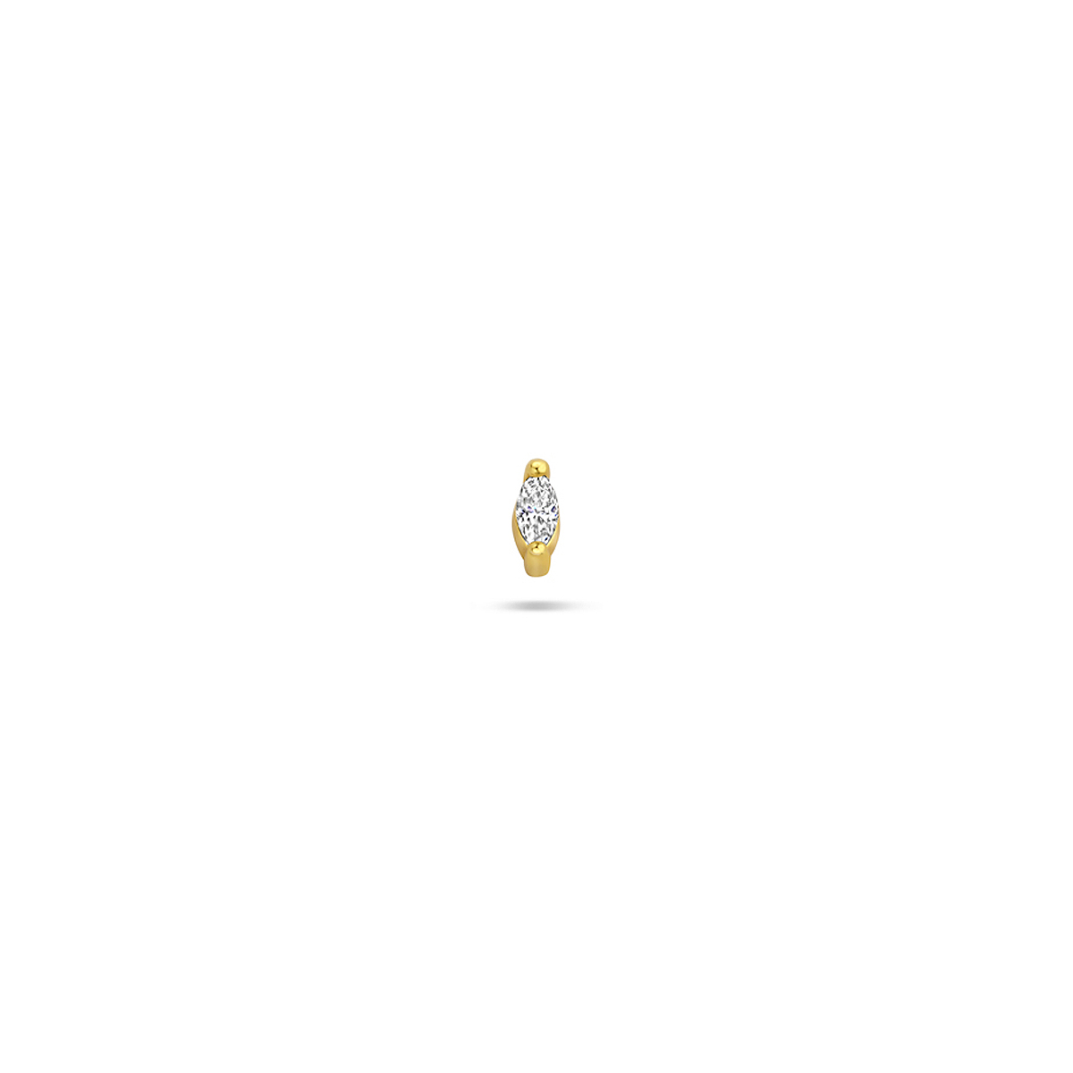 Verguld 925 zilveren flat back piercing met schroefdraad uitgevoerd met zirkonia. Deze piercing heeft een afmeting van 4×1,7mm, een buis lengte van 6,5mm en een buisdikte van 1mm. Worden per stuk verkocht. Geen garantie op plating.