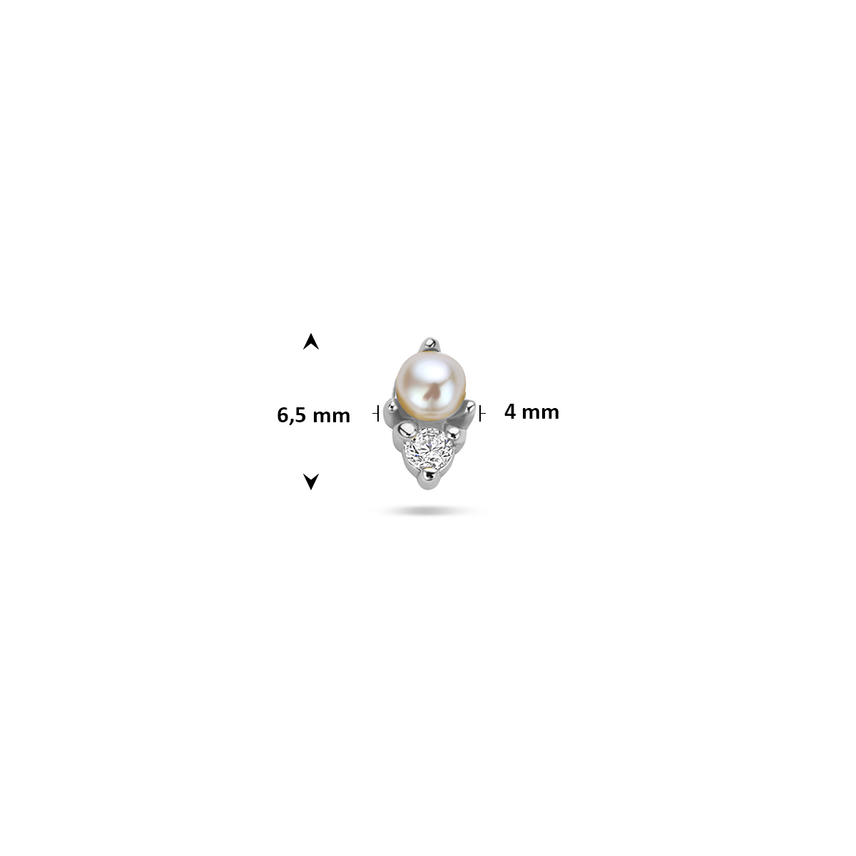 Gerhodineerd 925 zilveren flat back piercing met schroefdraad uitgevoerd met een parel en zirkonia. Deze piercing heeft een afmeting van 6,5x4mm, een buis lengte van 6,5mm en een buisdikte van 1mm. Worden per stuk verkocht.