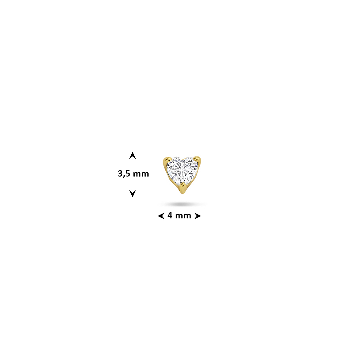Verguld 925 zilveren flat back piercing uitgevoerd met zirkonia in de vorm van een hartje en schroefdraad. Deze piercing heeft een afmeting van 3,5x4mm, een buis lengte van 6,5mm en een buisdikte van 1mm. Worden per stuk verkocht. Geen garantie op plating.