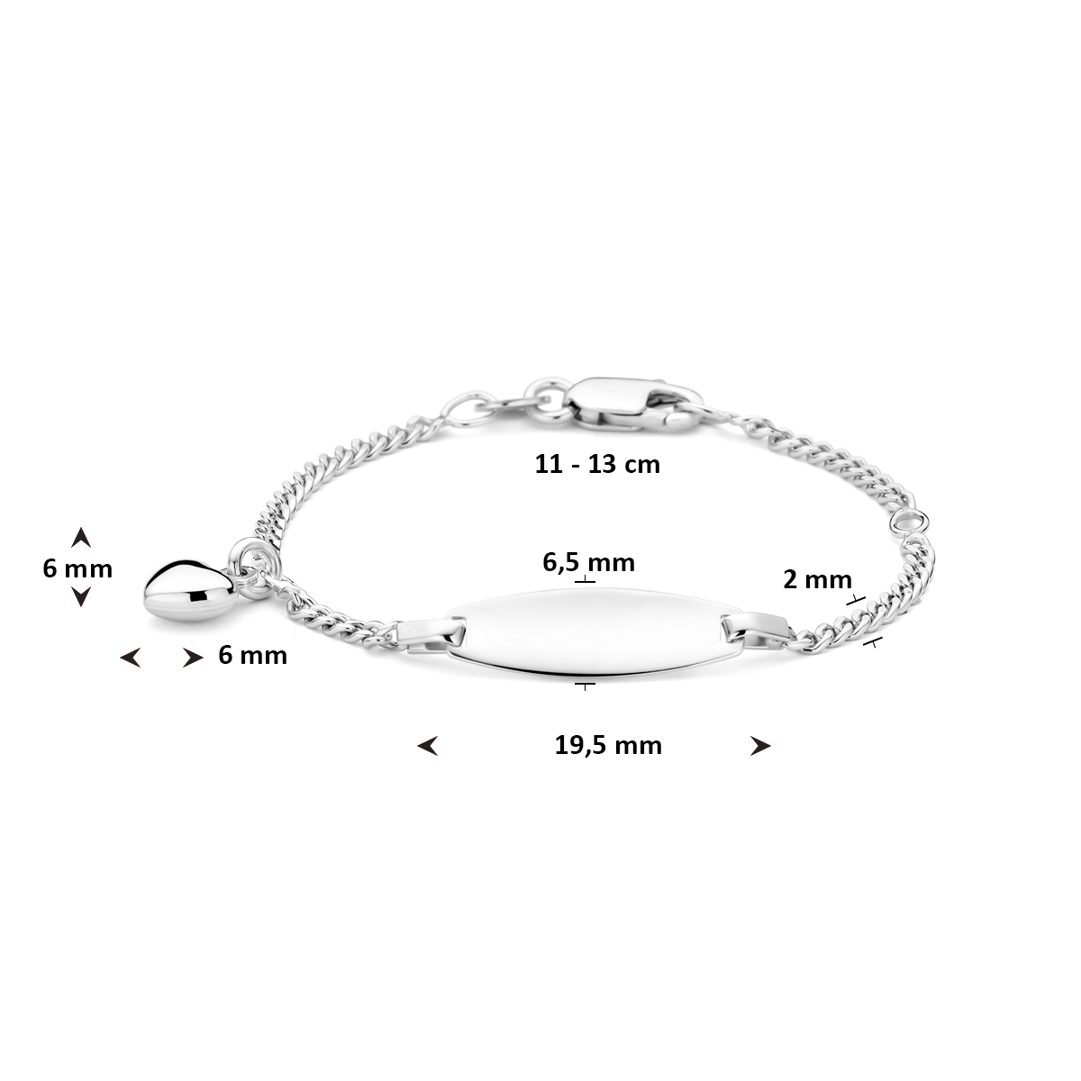 Gerhodineerd 925 zilveren graveerarmband uitgevoerd met een hartje. De armband heeft draaglengtes van 11-13cm en een schakelbreedte van 2mm. Het graveerplaatje heeft een afmeting van 6.5×19.5mm.