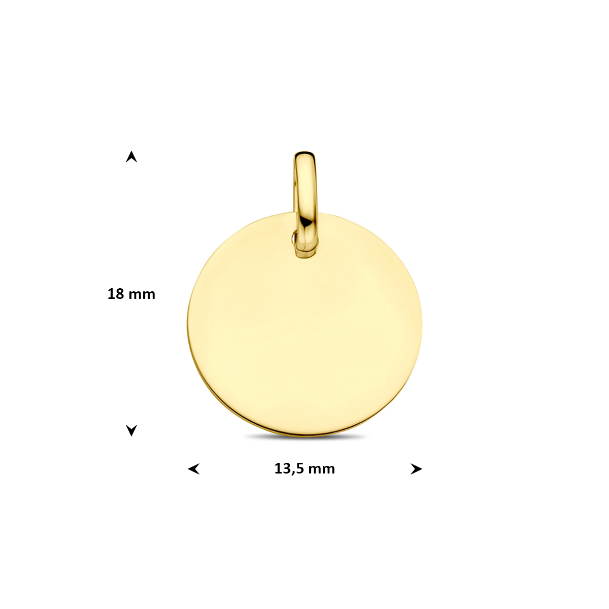 14k Geelgouden graveerhanger met een diameter van 13,5mm en een dikte van 0,5mm.