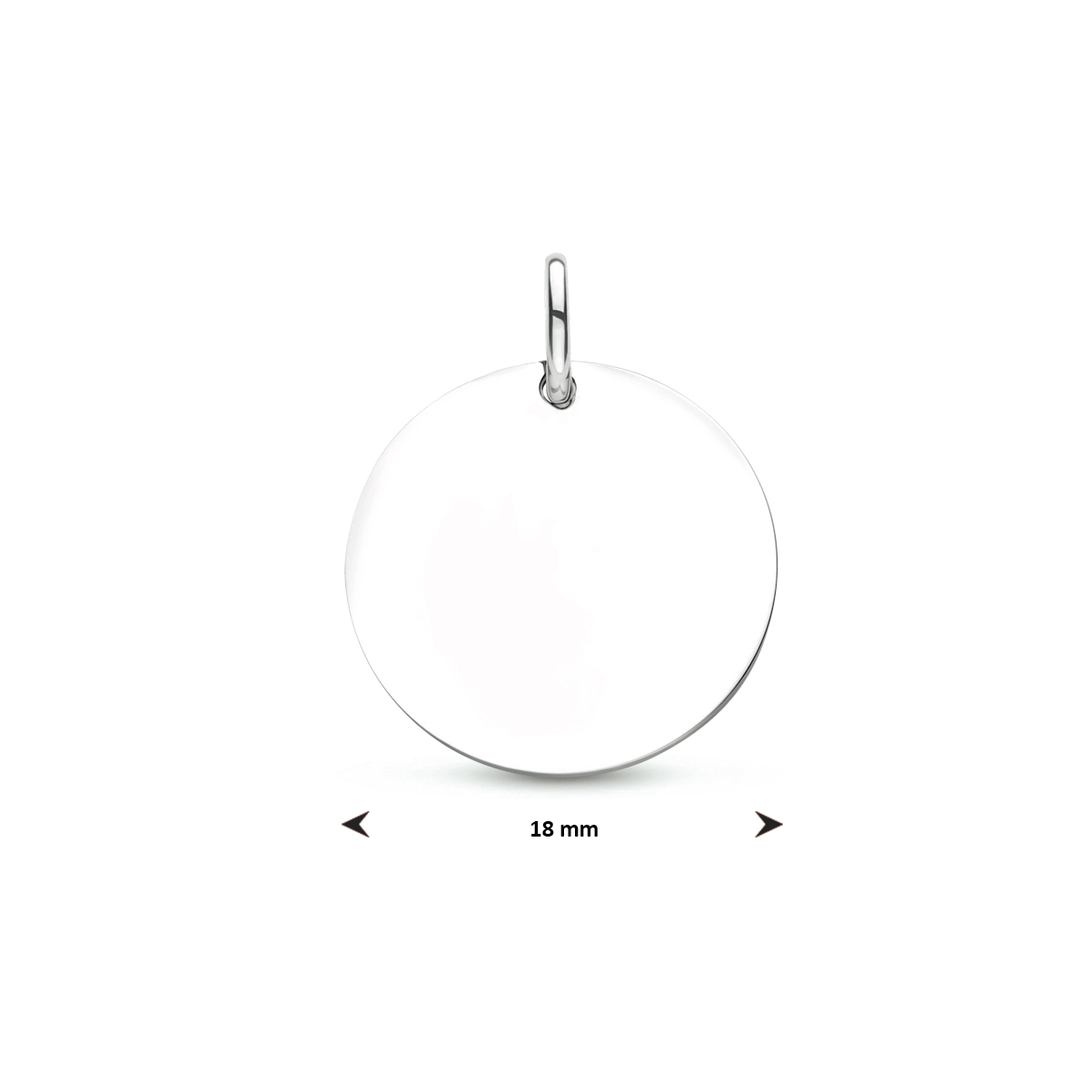 Gerhodineerd 925 zilveren graveerhanger. De hanger heeft een diameter van 18mm en een dikte van 0.6mm.