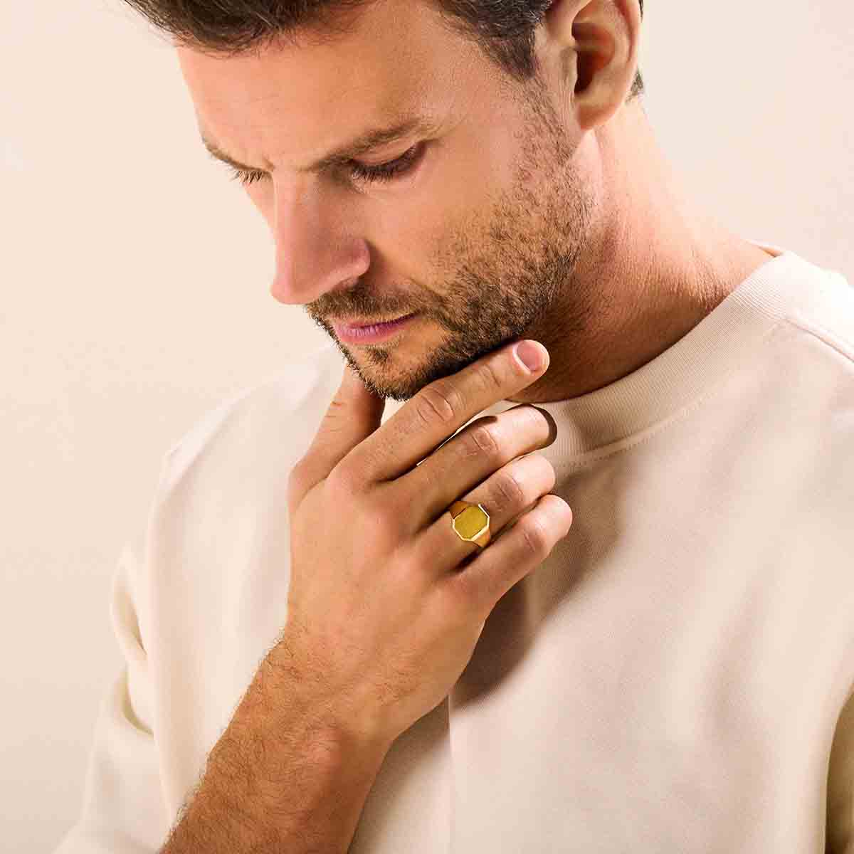 Stijlvolle geelgouden massieve graveerring met een afmeting van 16.5×14.5mm. De gediamanteerde afwerking en de robuuste afkantingen maken de ring helemaal af. De ring geeft je look direct een chique uitstraling.