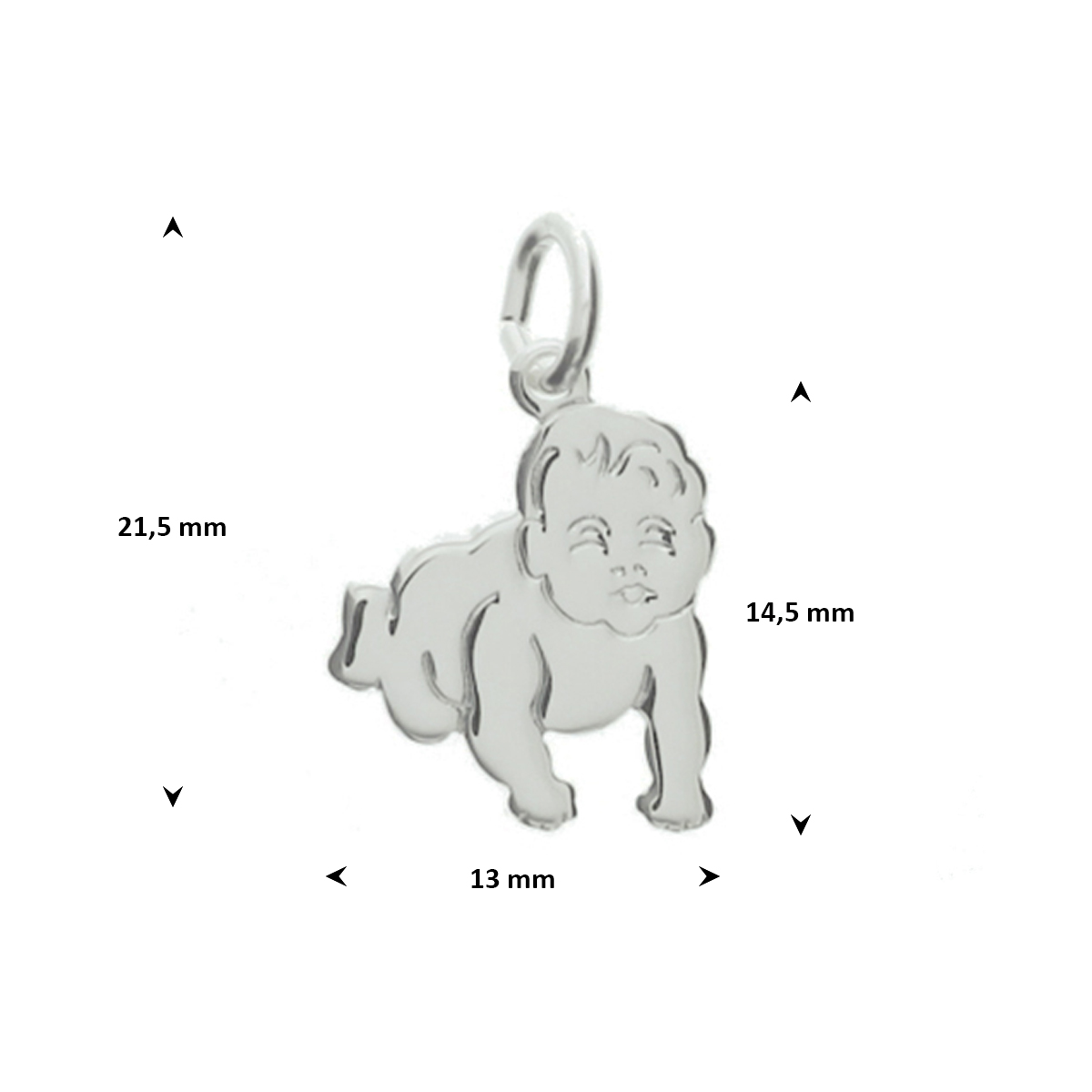 Gerhodineerd 925 zilveren hanger in de vorm van een baby, De hanger heeft een hoogte van 14.5mm excl. oogje en een breedte van 13mm.