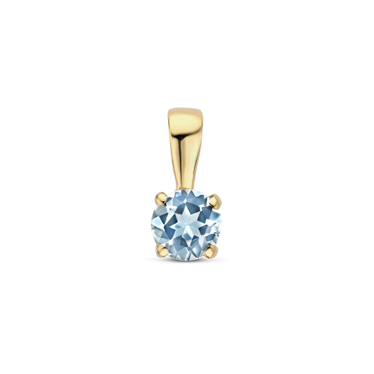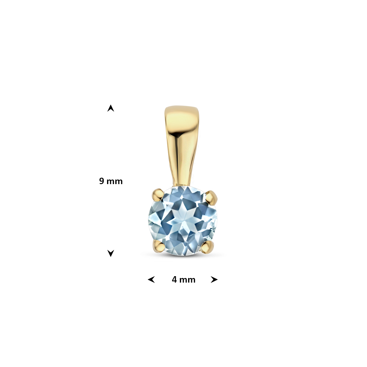 14k Geelgouden hanger uitgevoerd met blauw topaas. De hanger heeft een afmeting van 9x4mm. De steen heeft een diameter van 4mm.
