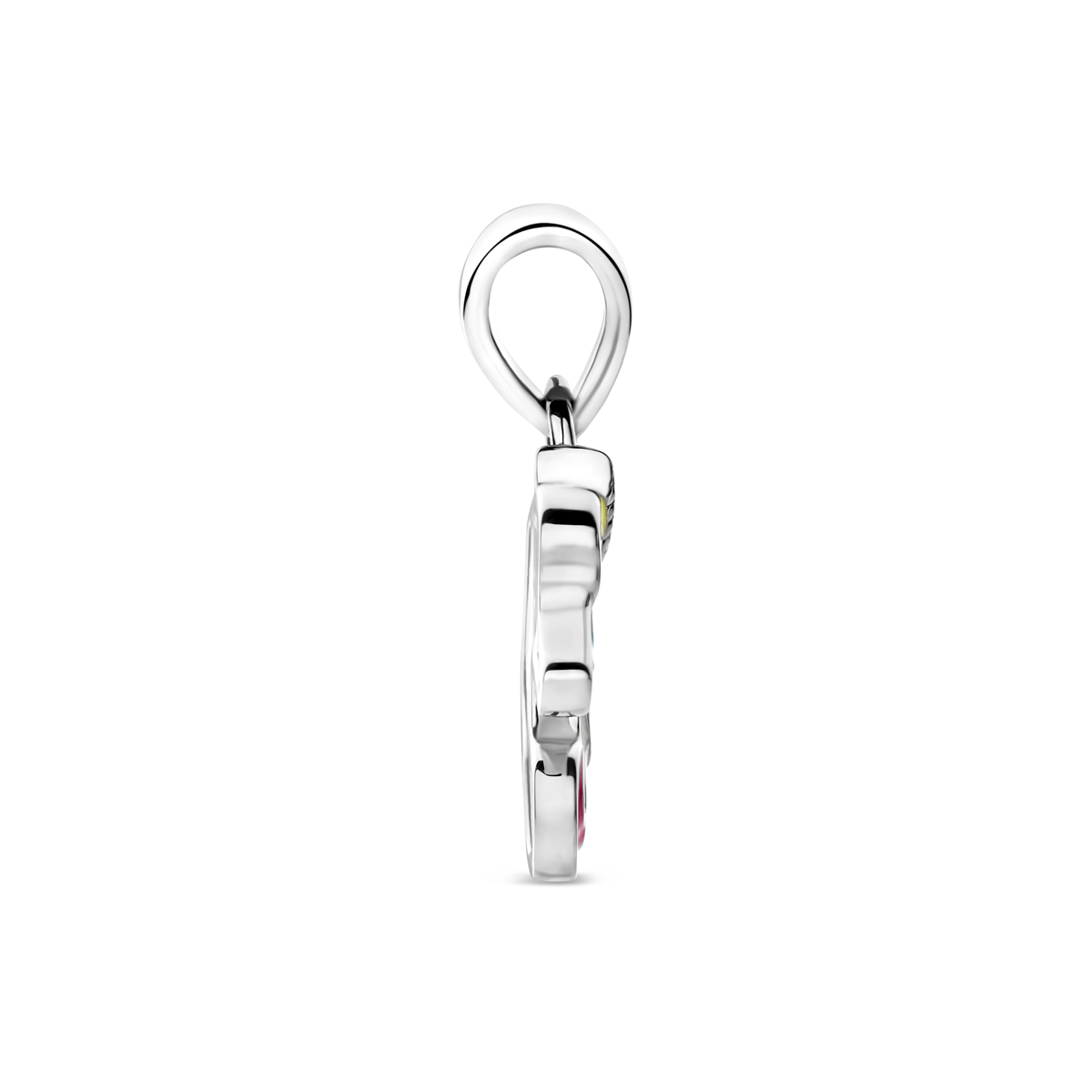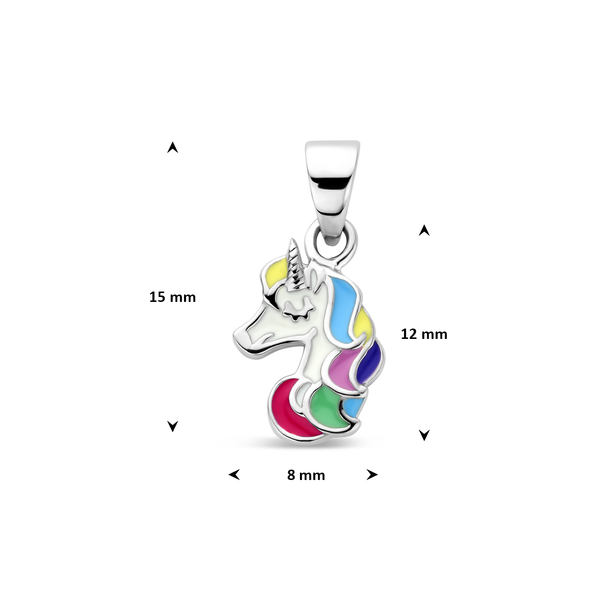 Gerhodineerd 925 zilveren hanger in de vorm van een eenhoorn, uitgevoerd met gekleurd emaille. De hanger heeft een totale hoogte van 1.5cm en een breedte van 8mm.