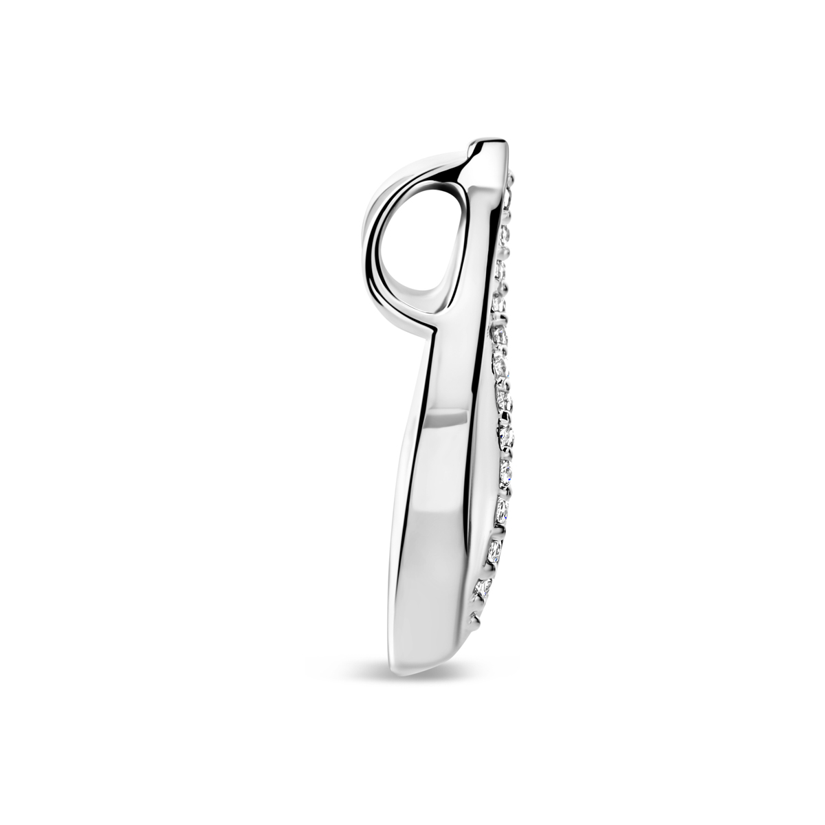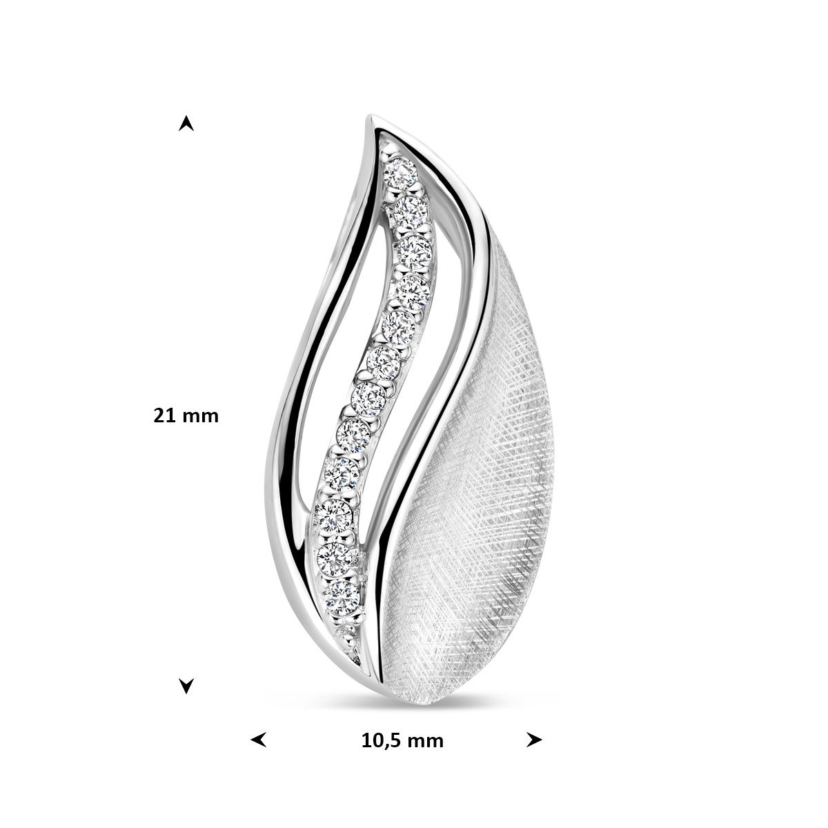 Gerhodineerd zilveren hanger met zirkonia en een poli/gescratchte bewerking. De hanger heeft een afmeting van 21×10.5mm.