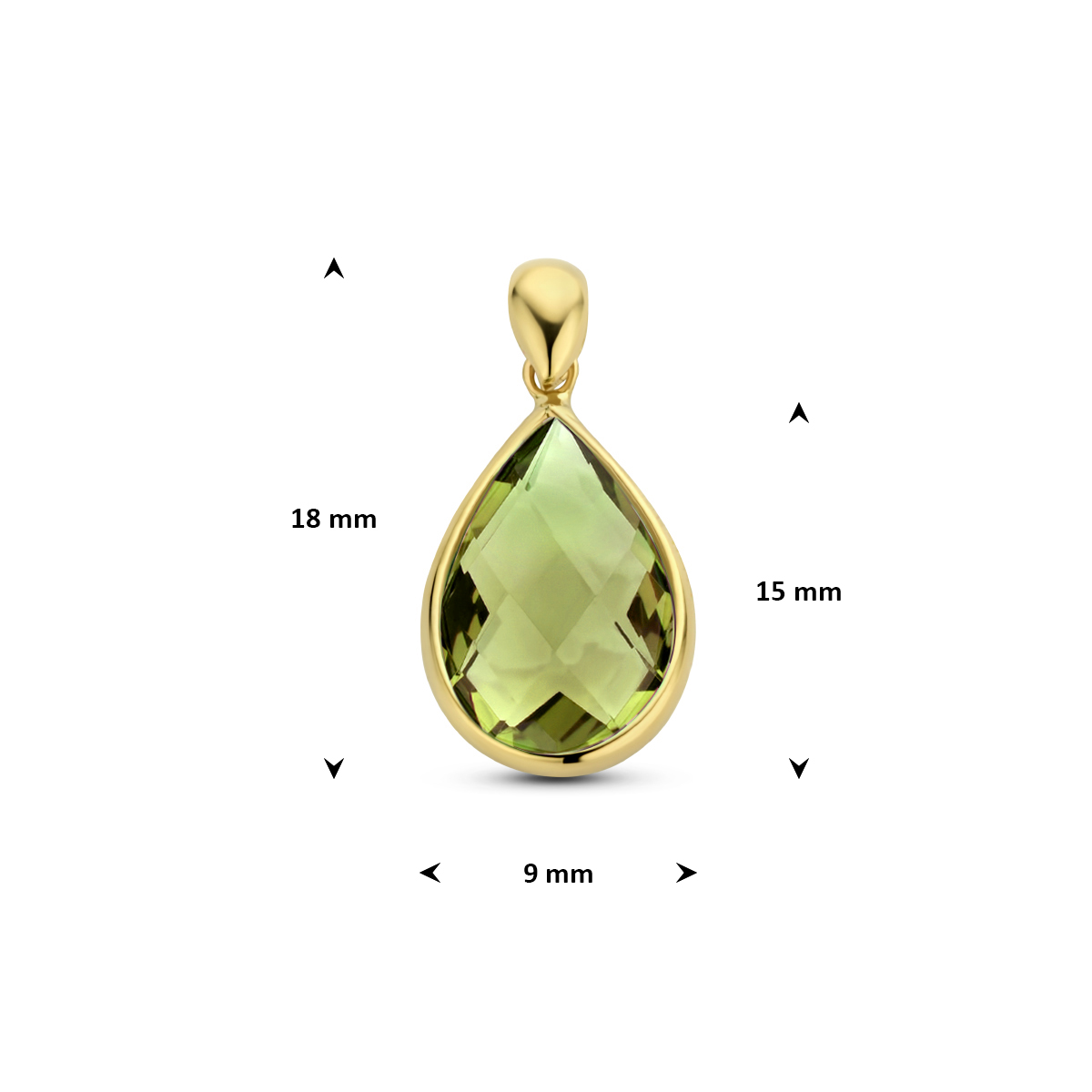 14k Geelgouden hanger uitgevoerd met een schitterende groen kwarts. De hanger heeft een totale hoogte van 18mm.