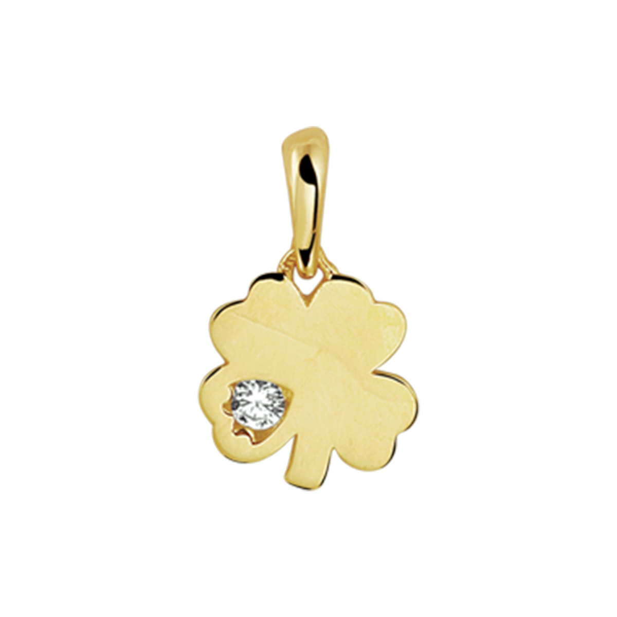 Geelgouden poli afgewerkte klaver hanger uitgevoerd met een ingespannen briljant geslepen zirkonia. De hanger heeft een totale hoogte van 13mm en de klaver is 9x8mm en is uitgevoerd met een stevig hangoog.