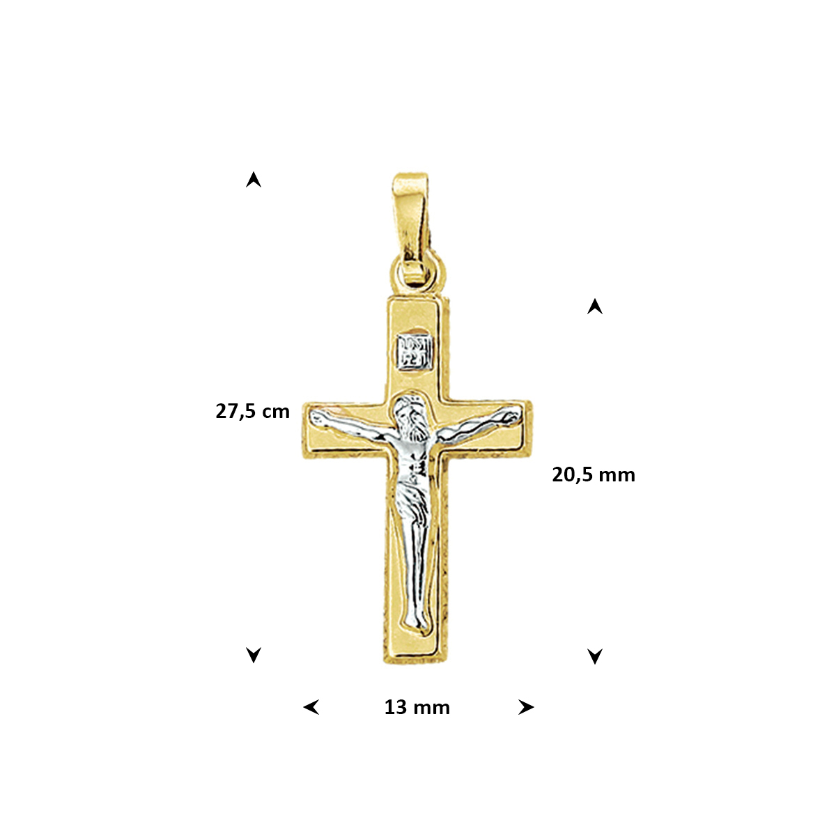 14k Geelgouden hanger met een kruis en gestift corpus. De hanger heeft een hoogte van 20,5mm excl. oogje.