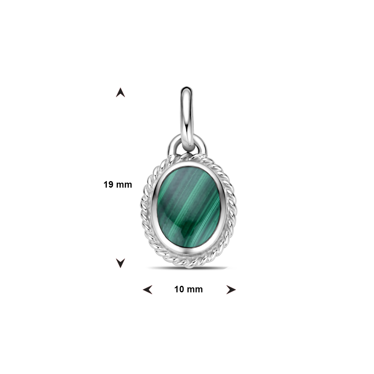 Gerhodineerd 925 zilveren hanger uitgevoerd met malachiet. De hanger heeft een totale hoogte van 19mm en een breedte van 10mm.