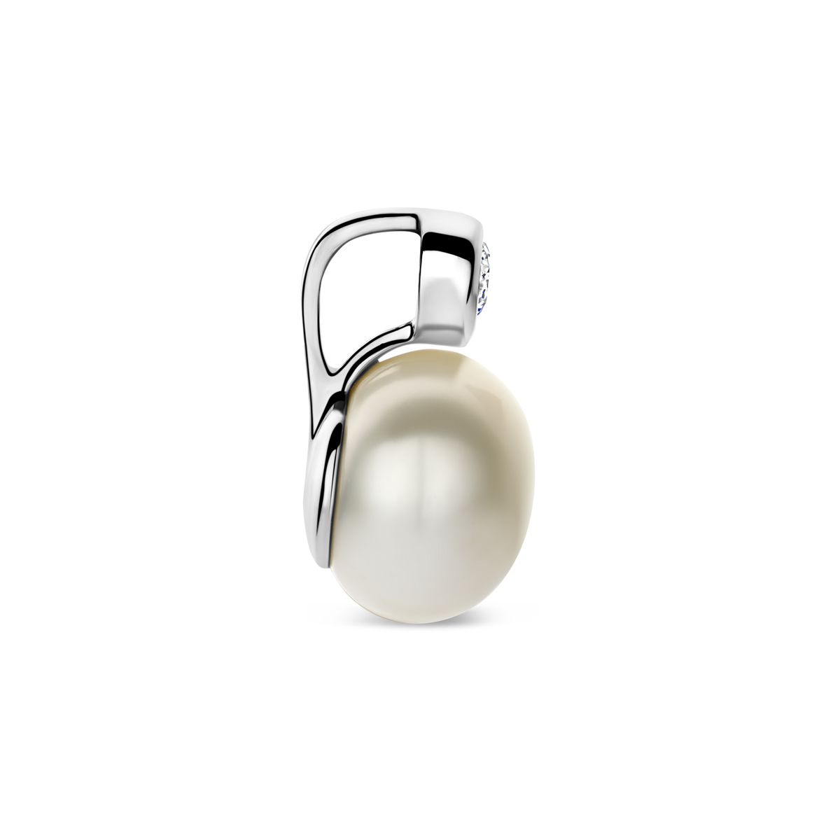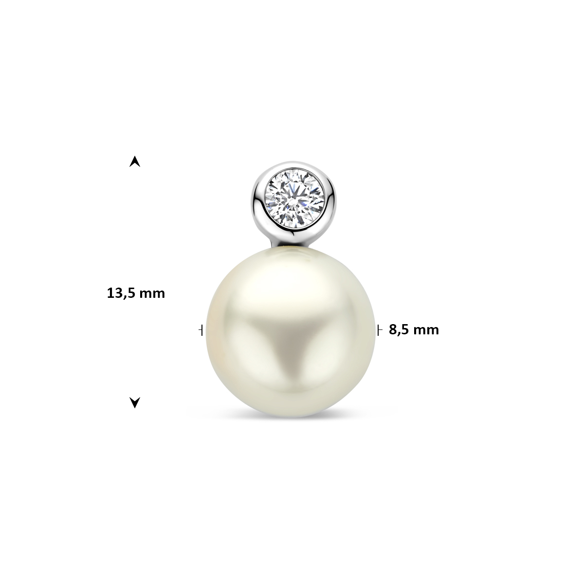 Gerhodineerd zilveren hanger met zirkonia en parel. De hanger heeft een afmeting van 13.5×8.5mm.