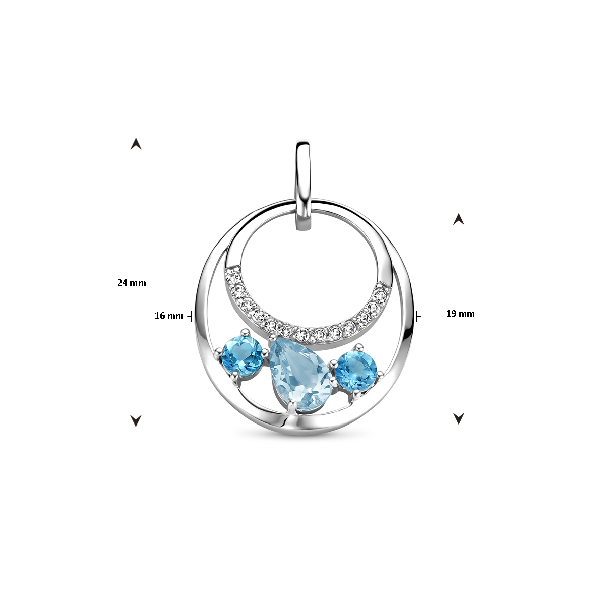 Gerhodineerd 925 zilveren hanger uitgevoerd met blauw en wit topaas. De hanger heeft een totale hoogte van 24mm.