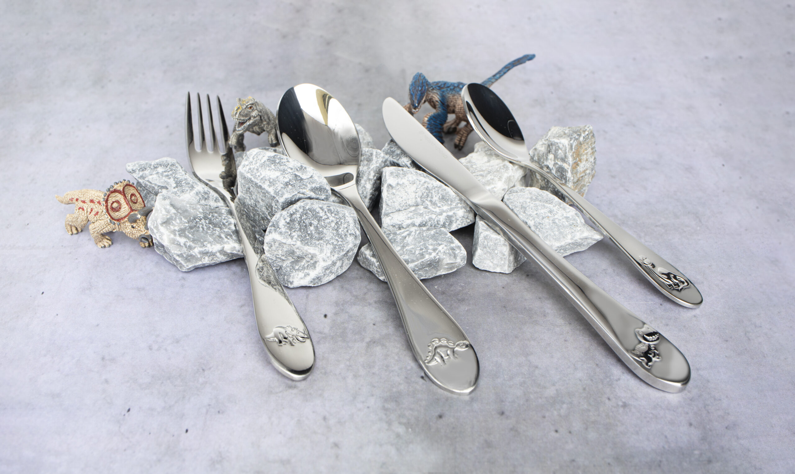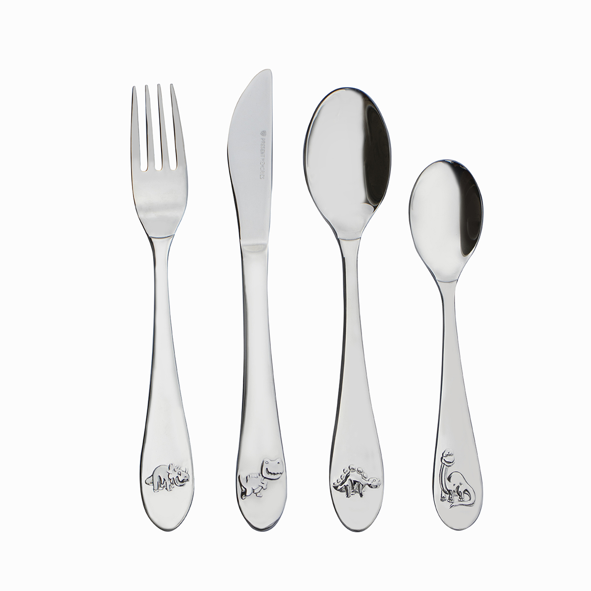 18/10 Stalen kinderbestek in een 4-delige set met superleuk dino thema. Leuk om aan de voor- en/of achterzijde te graveren. De set bestaat uit: een mes van 190x18mm, een vork van 172x22mm, een lepel van 170x34mm en een dessertlepel van 140x28mm. Wegens hoge bezorgkosten wordt dit artikel alleen verstuurd bij een ordergrootte vanaf €50,-.