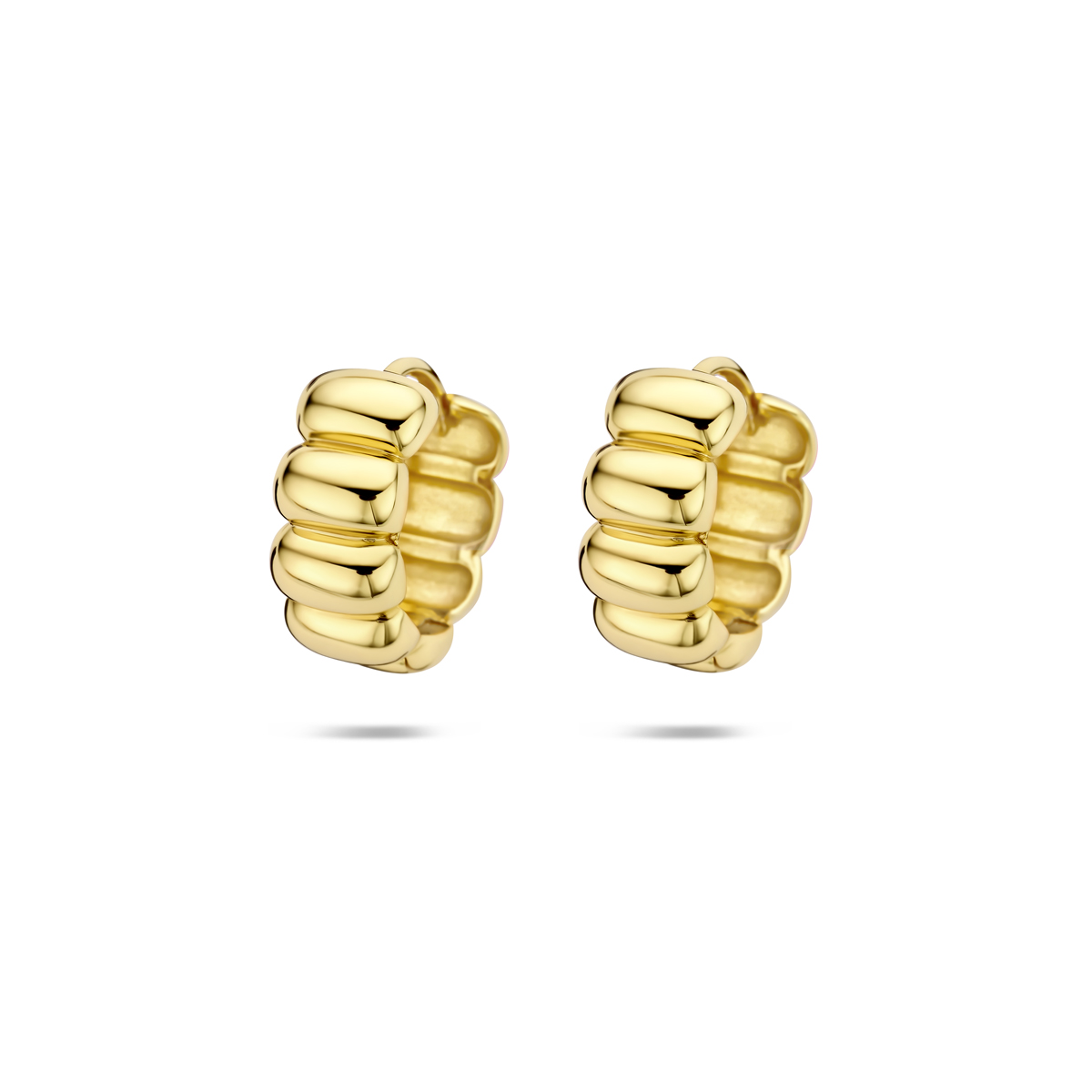 Verguld geel op 925 zilveren klapoorringen met een afmeting van 13.5×14.5mm en een dikte van 6mm. Geen garantie op plating.