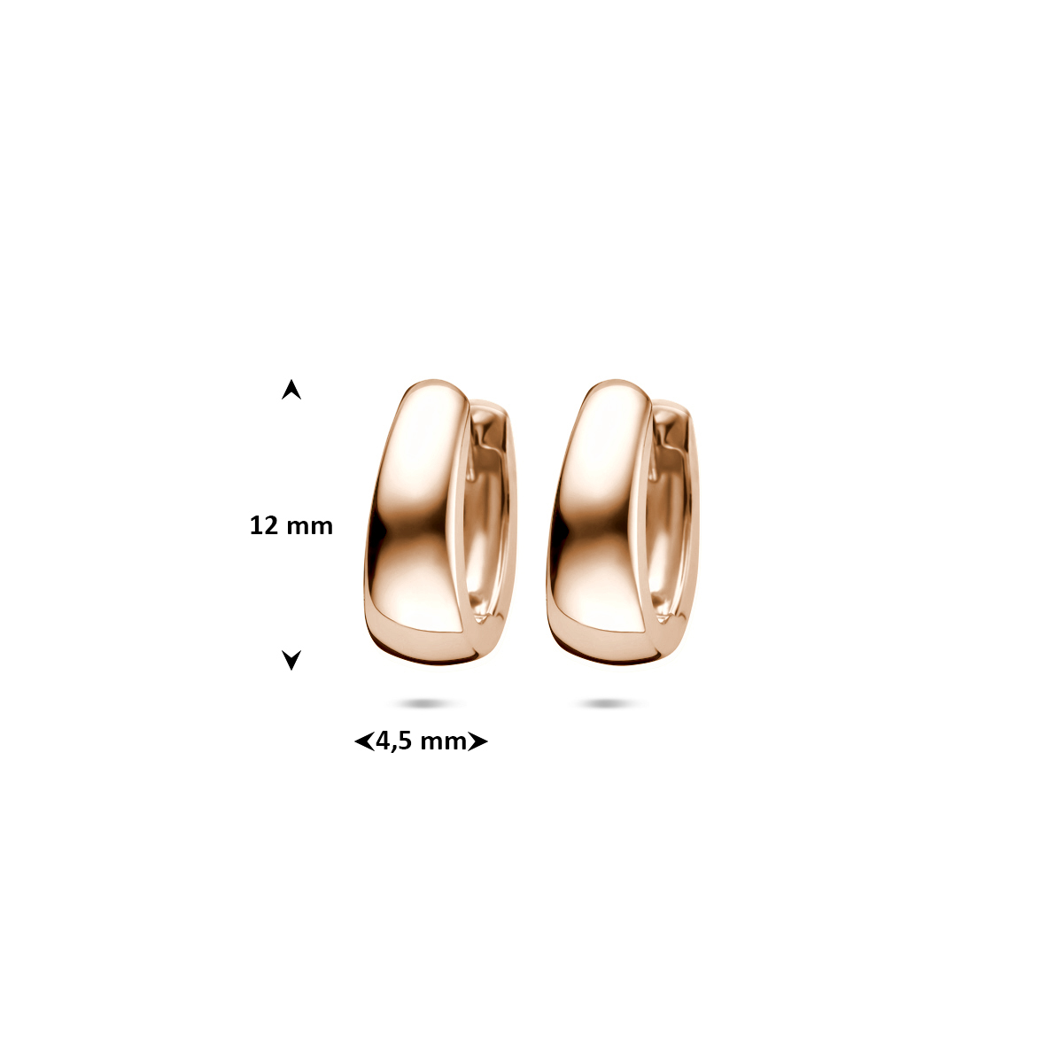 Rosegouden klapoorringen met een afmeting van 12×4.5mm uigevoerd met een stevige scharnier sluiting. De klapoorringen zijn ook verkrijgbaar in het geel en witgoud.